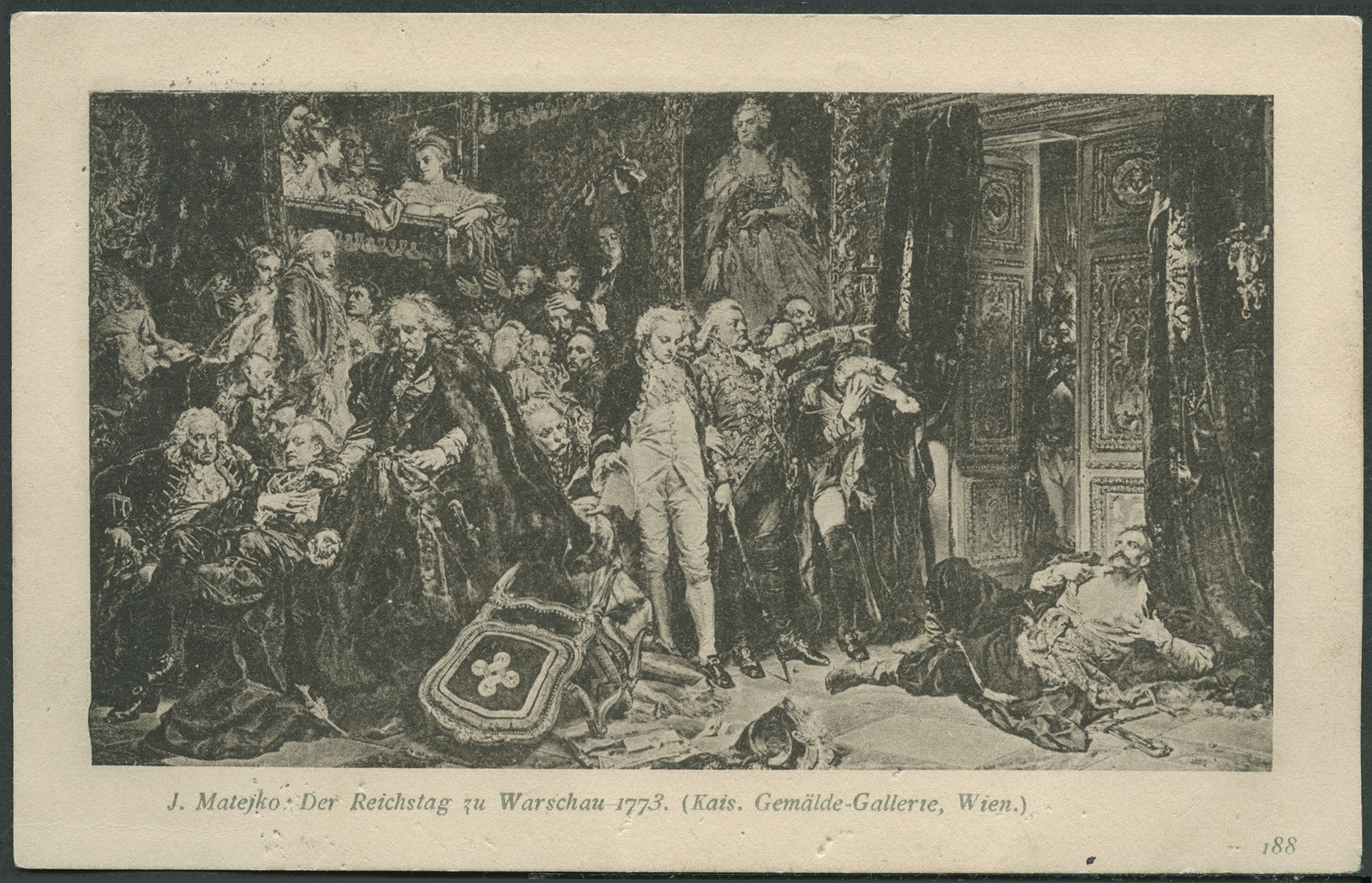 Nazwa: Reprodukcja malarstwa, Jan Matejko, "Rejtan", data: 1906, miejsce: , typ obiektu: , wymiary8,9 x 14, opis: Scena przedstawiająca sejm rozbiorowy.