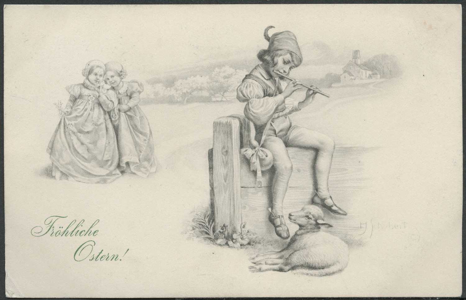 Nazwa: Reprodukcja rysunku, H. Schubert, data: 1908, miejsce: , typ obiektu: , wymiary8,9 x 13,9, opis: Chłopiec siedzący na drewnianym płocie i grający na fujarce, u jego stóp baranek, w tle dwie dziewczynki w długich sukienkach.