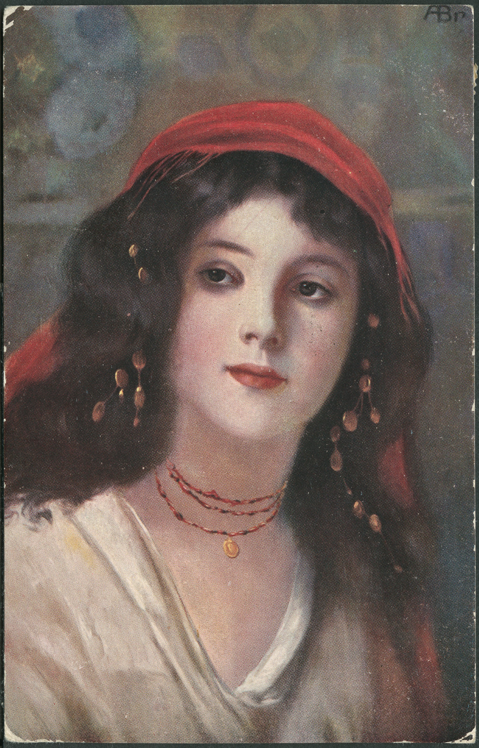 Nazwa: Reprodukcja malarstwa, "Kobieta z Orientu", data: 1905, miejsce: , typ obiektu: , wymiary14 x 9, opis: Popiersie, ciemne rozpuszczone włosy sięgające do ramion, na włosach czerwona chusta i sznurki z ozdobnymi wisiorkami, na szyi potrójny sznurek małych koralików i medalik.
