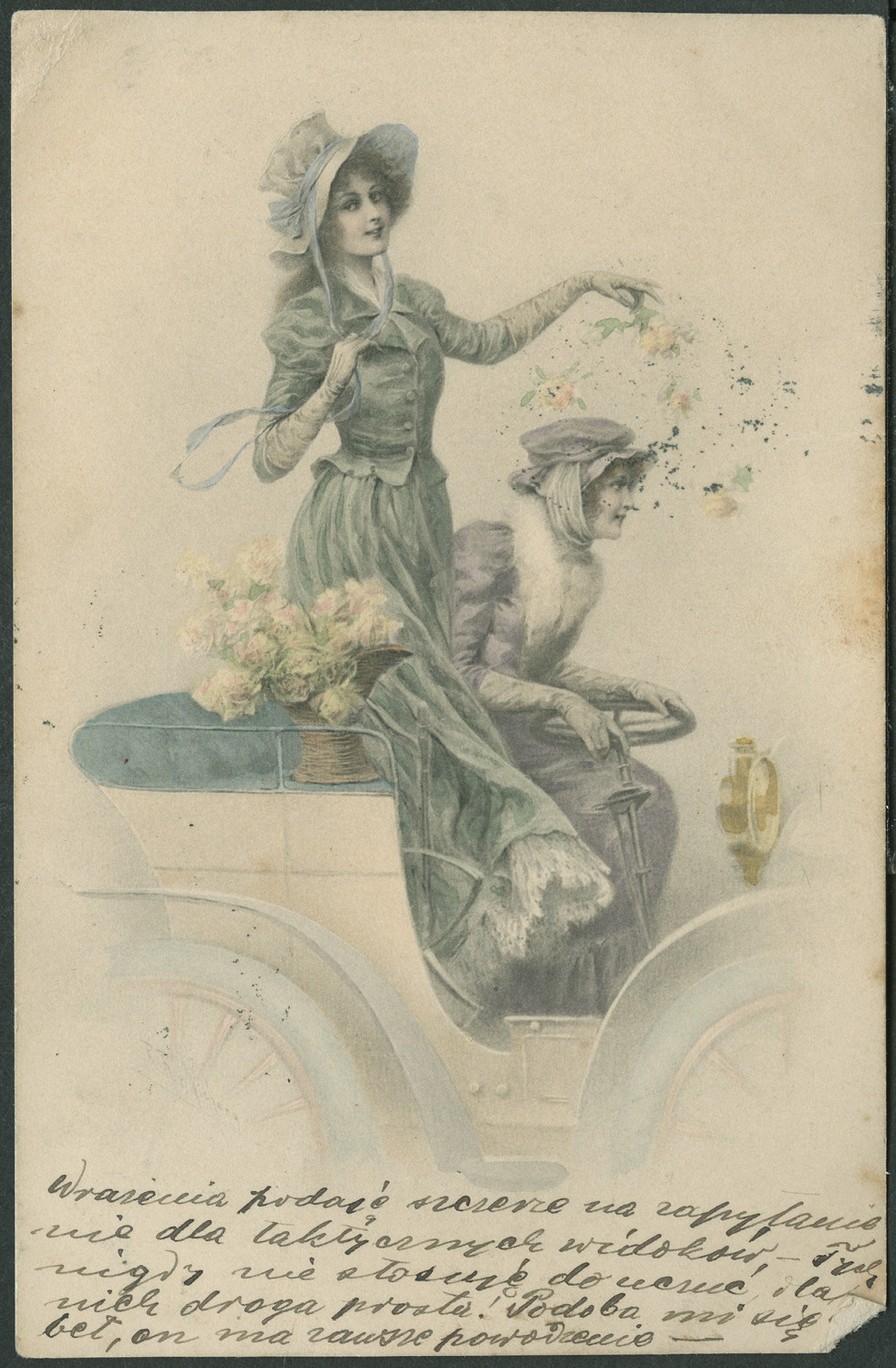 Nazwa: Reprodukcja rysunku, kobiety w aucie, data: 1905, miejsce: , typ obiektu: , wymiary13,6 x 8,8, opis: Dwie kobiety w długich sukniach i w kapeluszach w aucie, na fotelu którego leży kosz z kwiatami.