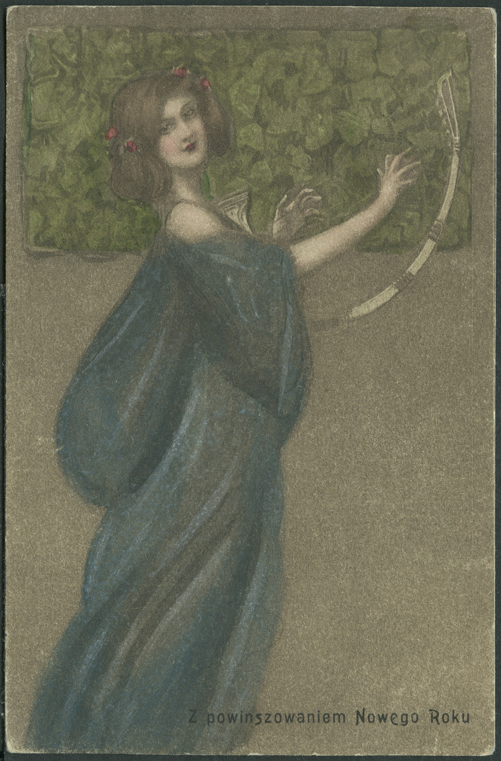 Nazwa: Reprodukcja rysunku, kobieta z harfą, data: pocz. XX w., miejsce: , typ obiektu: , wymiary13,9 x 9,1, opis: Kobieta w niebieskiej sukni grająca na harfie.