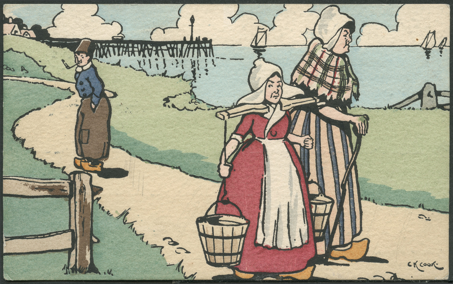 Nazwa: Reprodukcja rysunku, scena rodzajowa znad morza, data: 1905, miejsce: , typ obiektu: , wymiary8,6 x 14, opis: Droga biegnąca wzdłuż wybrzeża, a na niej dwie kobiety i mężczyzna z fajką w ustach, niższa kobieta niesie dwa wiadra, wyższa wspiera się na lasce.