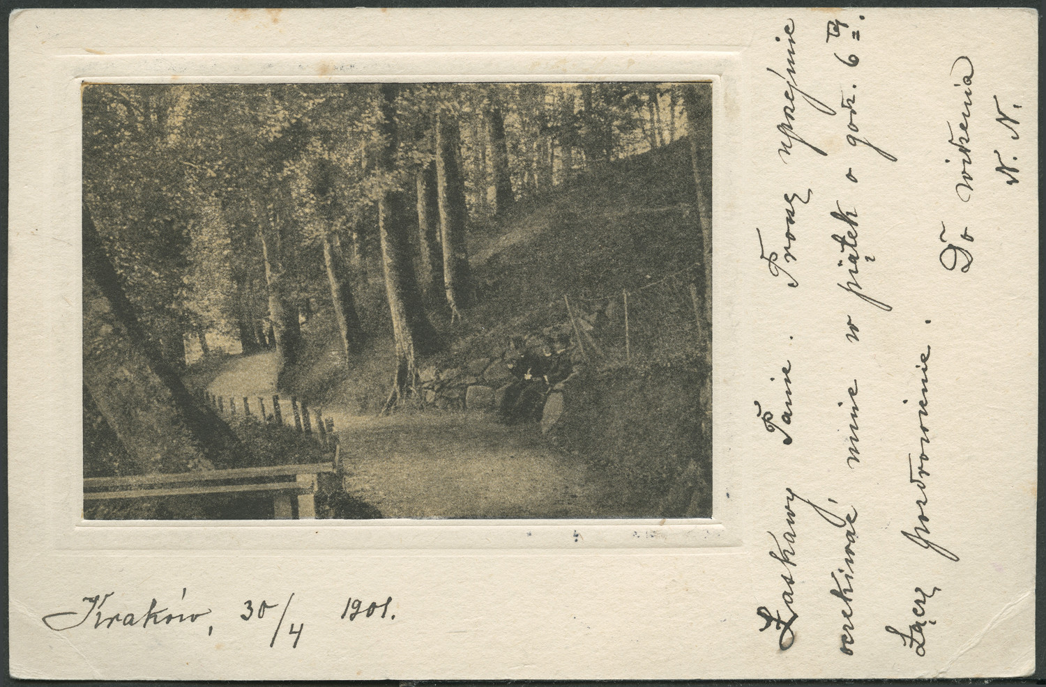 Nazwa: Reprodukcja ilustracji, ścieżka w parku, data: 1901, miejsce: , typ obiektu: , wymiary8,9 x 13,8, opis: Widok na drogę w parku, na ławce 3 postaci, wokół ilustracji i na odwrocie korespondencja odręczna.