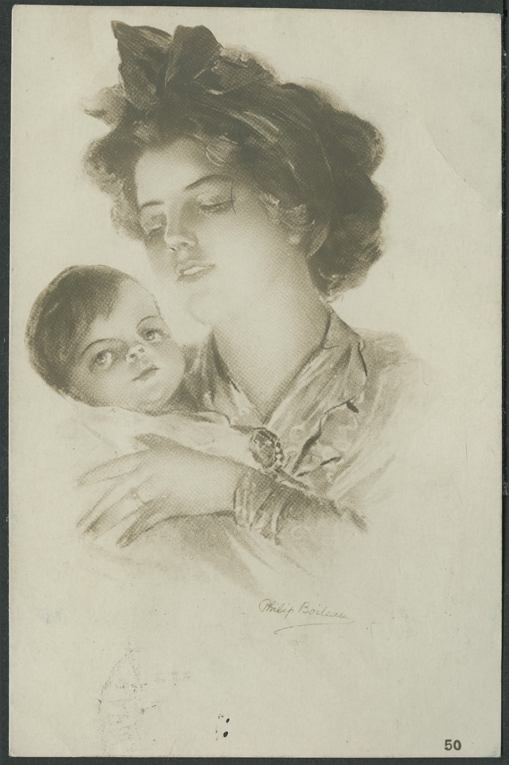 Nazwa: Reprodukcja rysunku Philipa Boileau, kobieta z dzieckiem, data: 1913, miejsce: , typ obiektu: , wymiary8,9 x 13,8, opis: Matka z dzieckiem, portret w popiersiu, autograf: Philip Boileau; na odwrocie korespondencja i znaczek poczty.