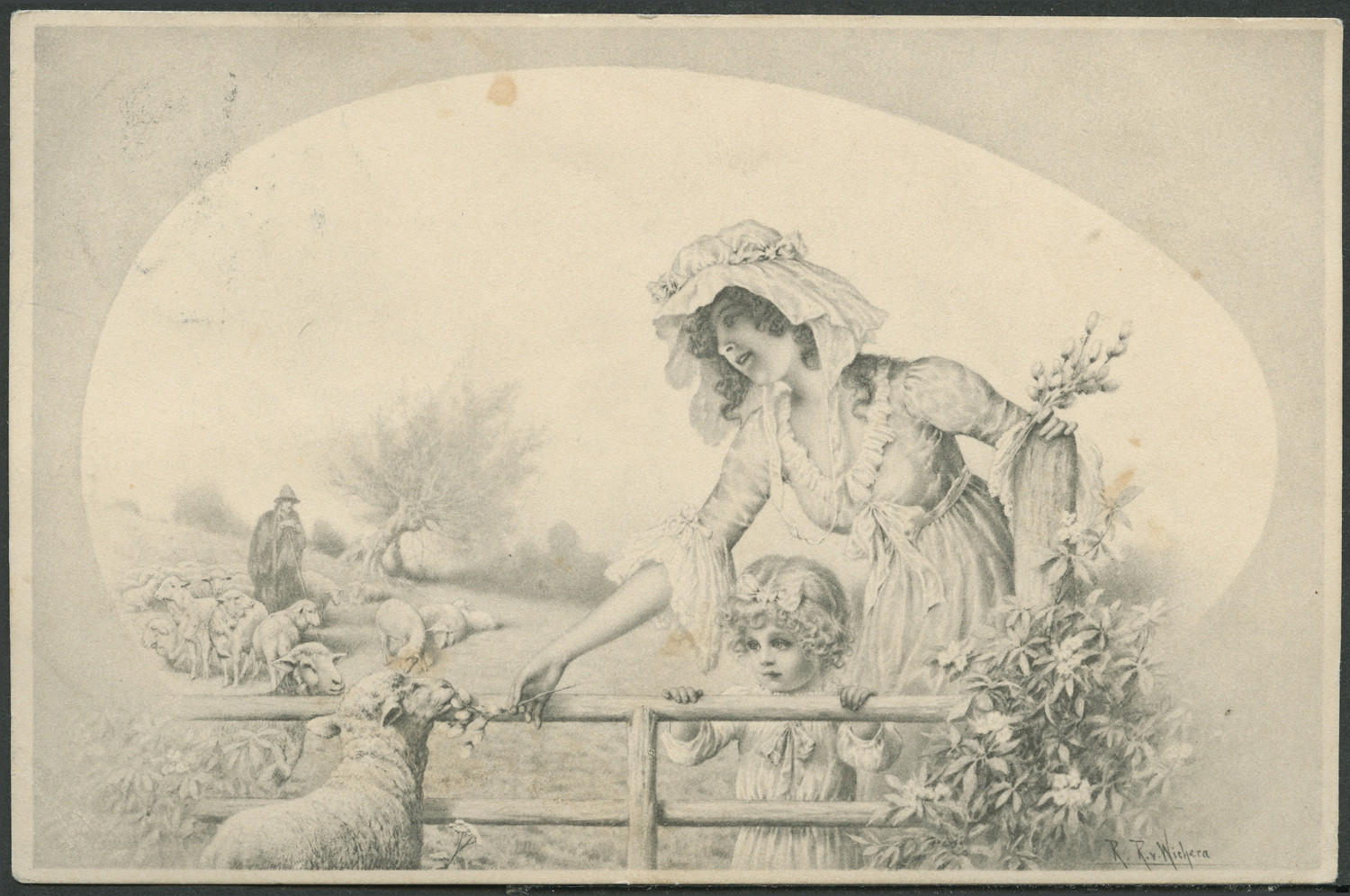 Nazwa: Reprodukcja rysunku Raimunda Wichery, scena pasterska, data: ok. 1905, miejsce: , typ obiektu: , wymiary9,1 x 13,9, opis: Kobieta z dziewczynką karmiące gałązkami owieczkę stojącą za płotem; w tle pasterz ze stadem owiec.