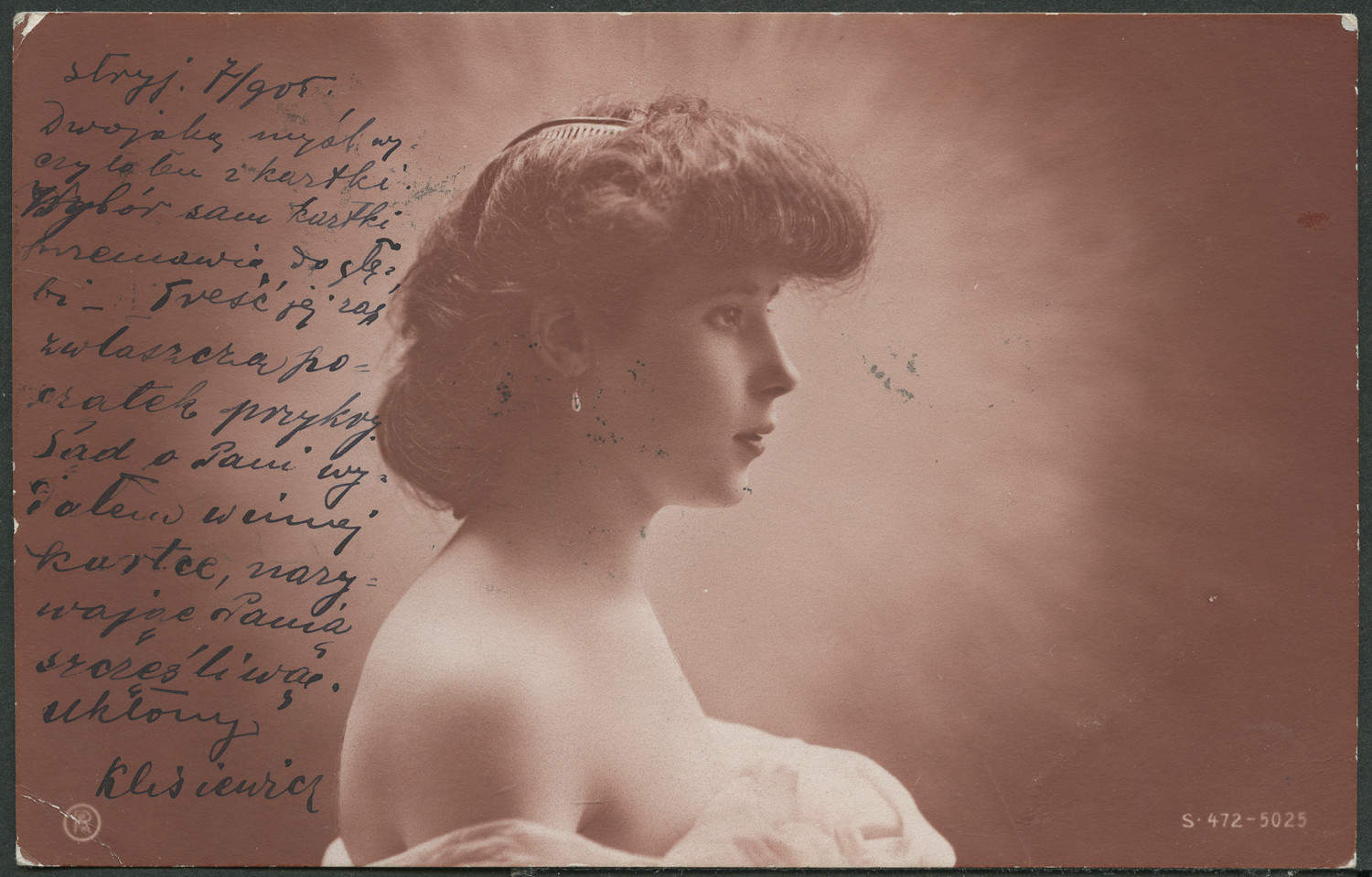 Nazwa: Portret kobiety, data: 1905, miejsce: , typ obiektu: , wymiary8,7 x 13,7, opis: Pocztówka, prawy profil kobiety z obnażonymi ramionami.