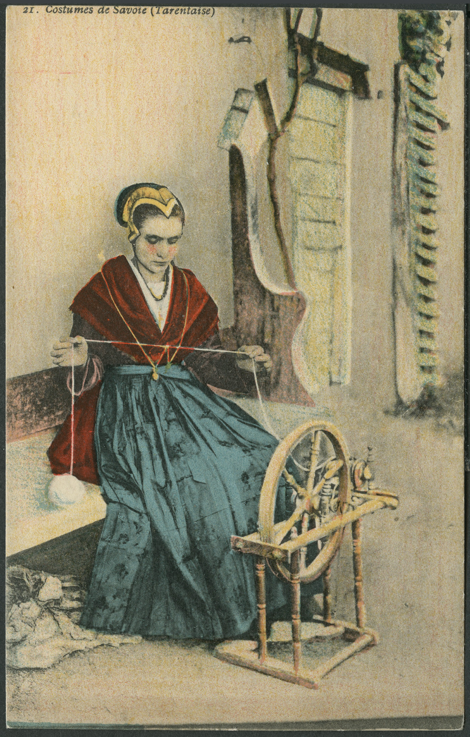 Nazwa: Reprodukcja rysunku, prządka, data: ok. 1905, miejsce: , typ obiektu: , wymiary13,8 x 8,7, opis: Prządka w stroju sabaudzkim.