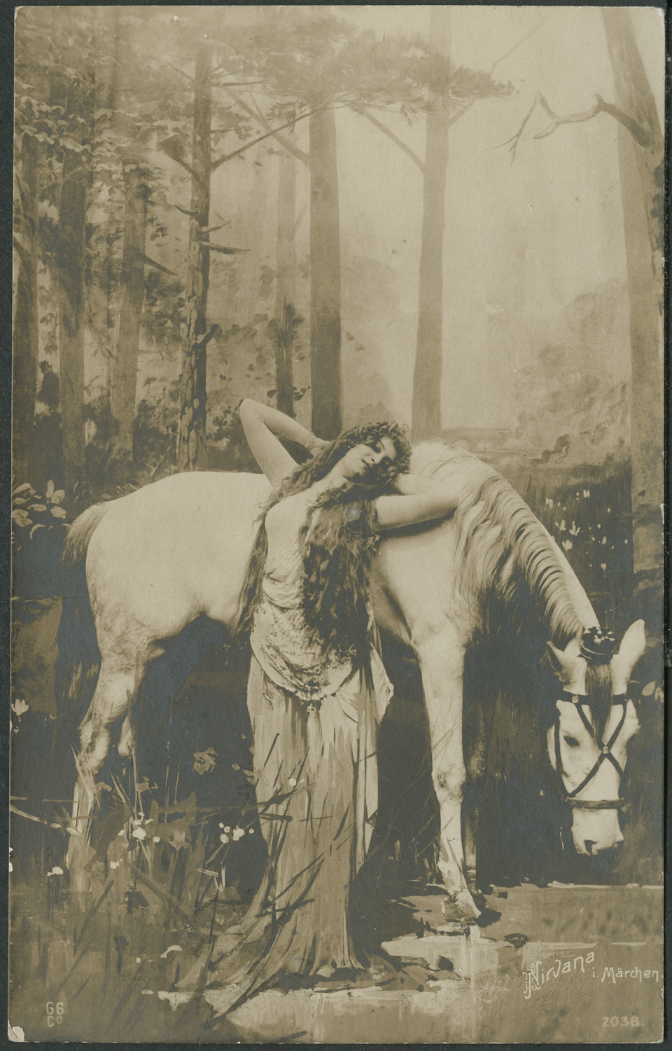 Nazwa: Kobieta z koniem, data: ok 1908, miejsce: , typ obiektu: , wymiary13,6 x 8,5, opis: Kobieta opierająca się na koniu, w tle natura.