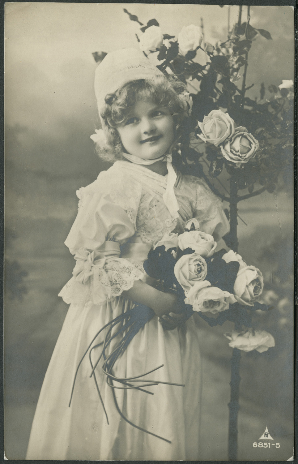 Nazwa: Dziewczynka z różami, portret, data: 1913, miejsce: , typ obiektu: , wymiary13,3 x 8,5, opis: Dziewczynka z różami, biały strój, w tle natura.