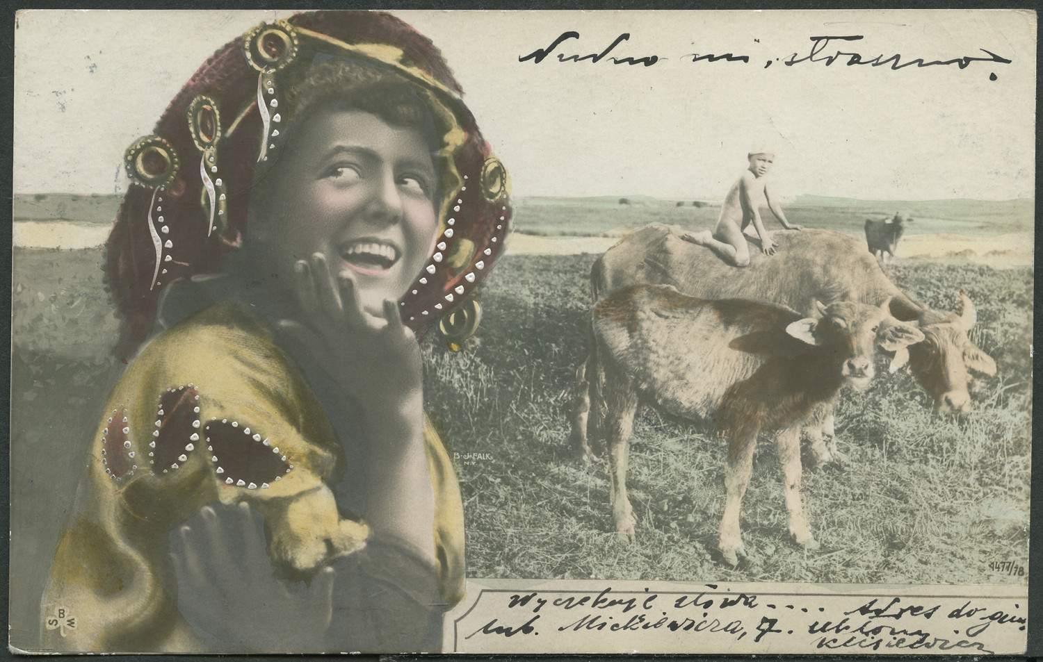 Nazwa: Scena rodzajowa na pastwisku, data: ok. 1905, miejsce: , typ obiektu: , wymiary13,8 x 8,9, opis: Scena rodzajowa na pastwisku: na I planie roześmiana kobieta w kostiumie historycznym, zdobiony beret, turban; w tle nagi chłopiec siedzący na pasącym się byku i cielak, równinny step w tle.
