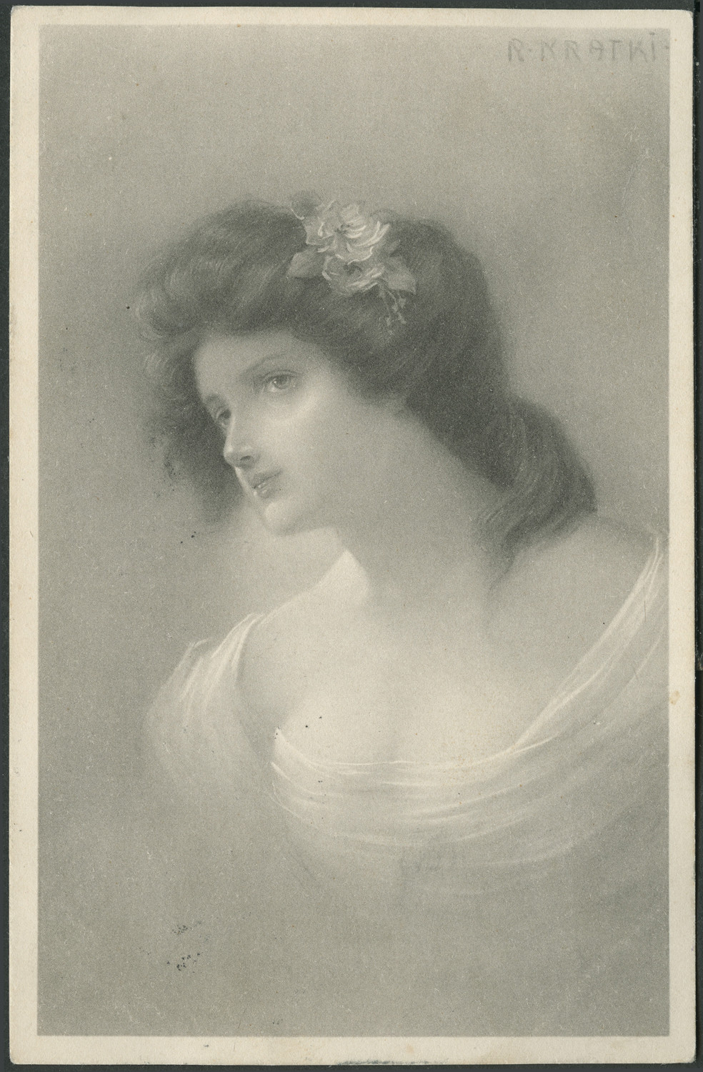 Nazwa: Reprodukcja rysunku. R. Kratki, młoda kobieta, data: 1907, miejsce: , typ obiektu: , wymiary13,9 x 9,0, opis: Portret, młoda kobieta w popiersiu, u góry sygnatura autora.