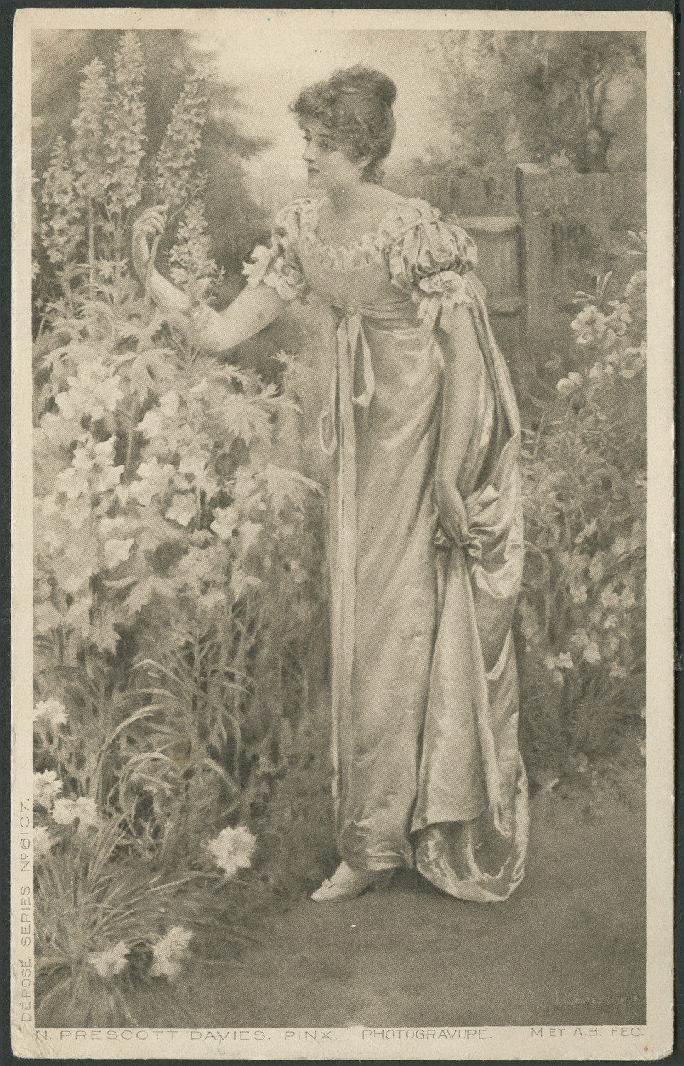 Nazwa: Reprodukcja malarstwa, Norman Prescott-Davies, kobieta w ogrodzie, data: ok. 1906, miejsce: , typ obiektu: , wymiary14,0 x 8,8, opis: Młoda kobieta w ogrodzie, cała postać w lewo, ogląda kwiaty na grządce; na marginesie nadruki firmowe i objaśniające.