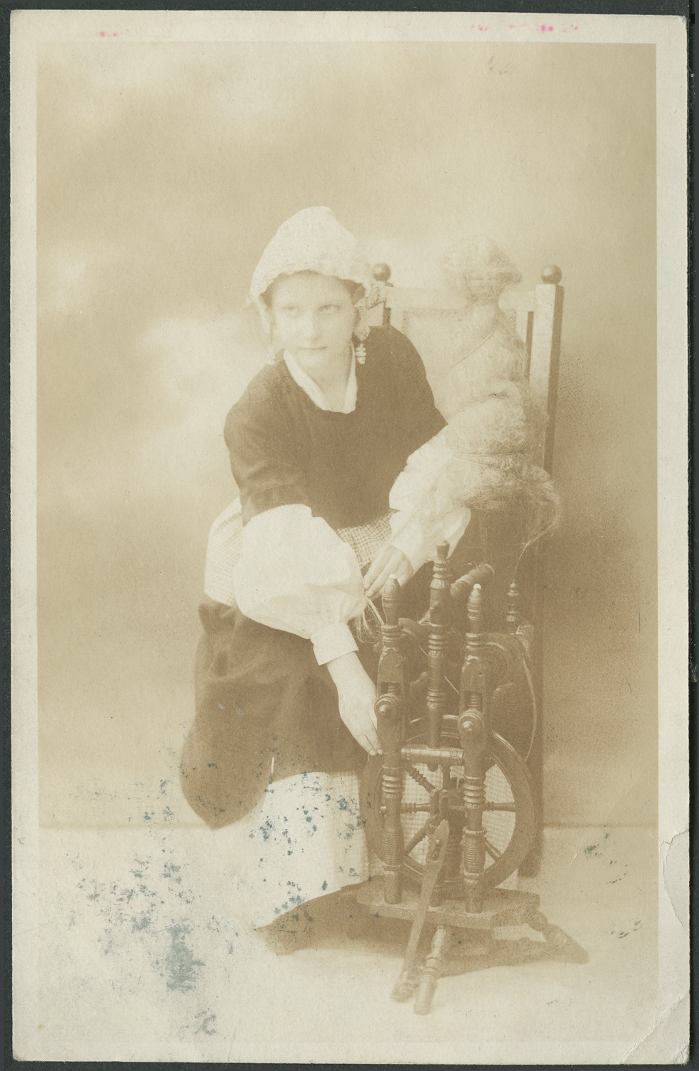 Nazwa: Kobieta przy kołowrotku, data: ok. 1906, miejsce: , typ obiektu: , wymiary13,8 x 8,9, opis: Młoda kobieta przy kołowrotku, biały margines.