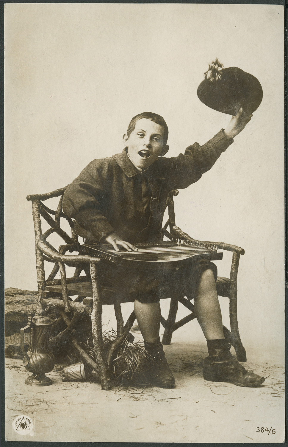 Nazwa: Reprodukcja rysunku, chłopiec z cytrą, data: 1904, miejsce: , typ obiektu: , wymiary13,5 x 8,7, opis: Chłopiec siedzący z cytrą na kolanach, trzymający czapkę w podniesionej ręce.