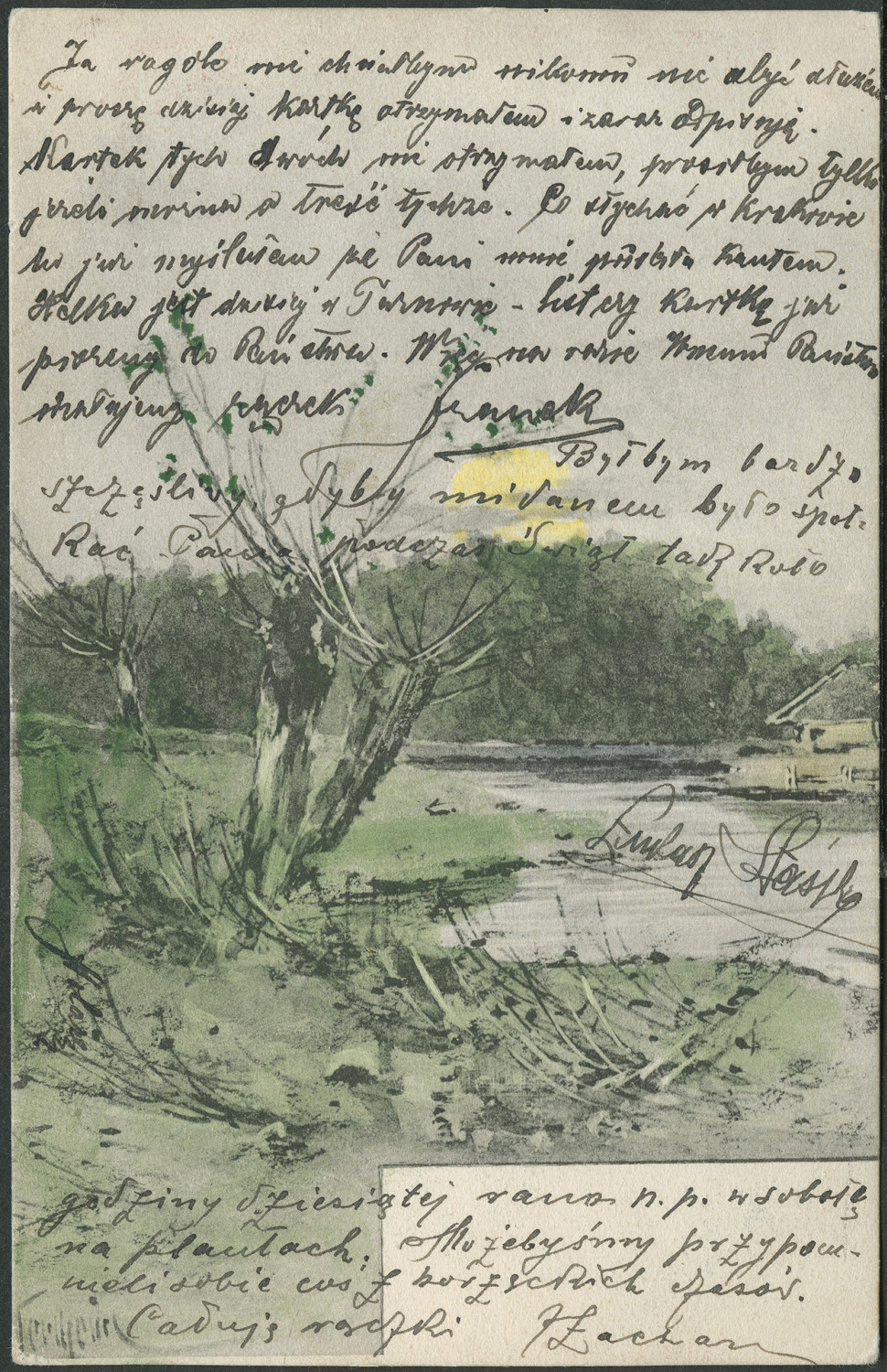 Nazwa: Reprodukcja malarstwa, pejzaż, dom nad rzeką, data: ok. 1905, miejsce: , typ obiektu: , wymiary13,9 x 9,0, opis: Pejzaż, wierzby i dom nad rzeką, druk kolorowy: czarny, szary, zielony, żółty; w pionie.