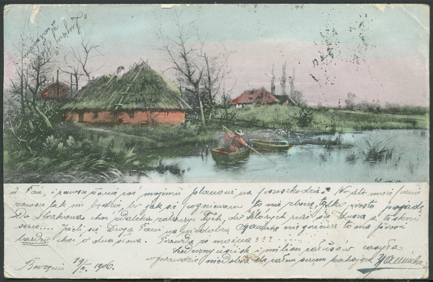 Nazwa: Reprodukcja malarstwa, pejzaż, chaty nad jeziorem, data: ok. 1906, miejsce: , typ obiektu: , wymiary9,0 x 13,9, opis: Pejzaż, chaty nad jeziorem, na którym znajdują się dwie łódki, w jednej wiosłuje człowiek, druk kolorowy.