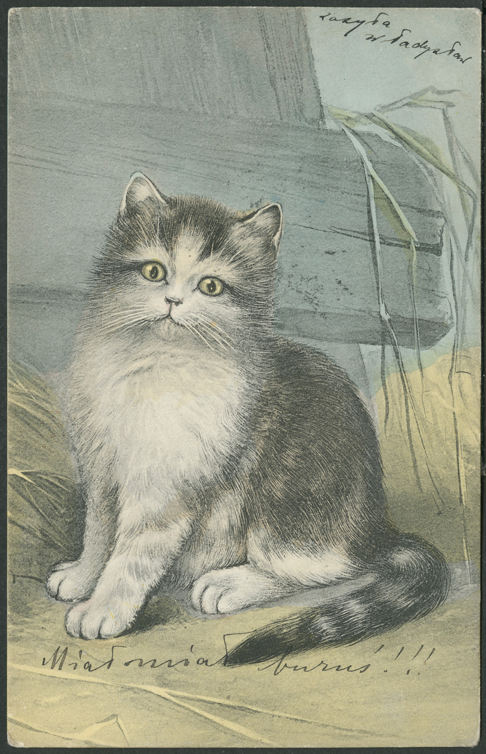 Nazwa: Reprodukcja rysunku, kot, data: ok. 1905, miejsce: , typ obiektu: , wymiary13,8 x 8,9, opis: Pocztówka, kot siedzący na trawie, w lewo, biało-szary.