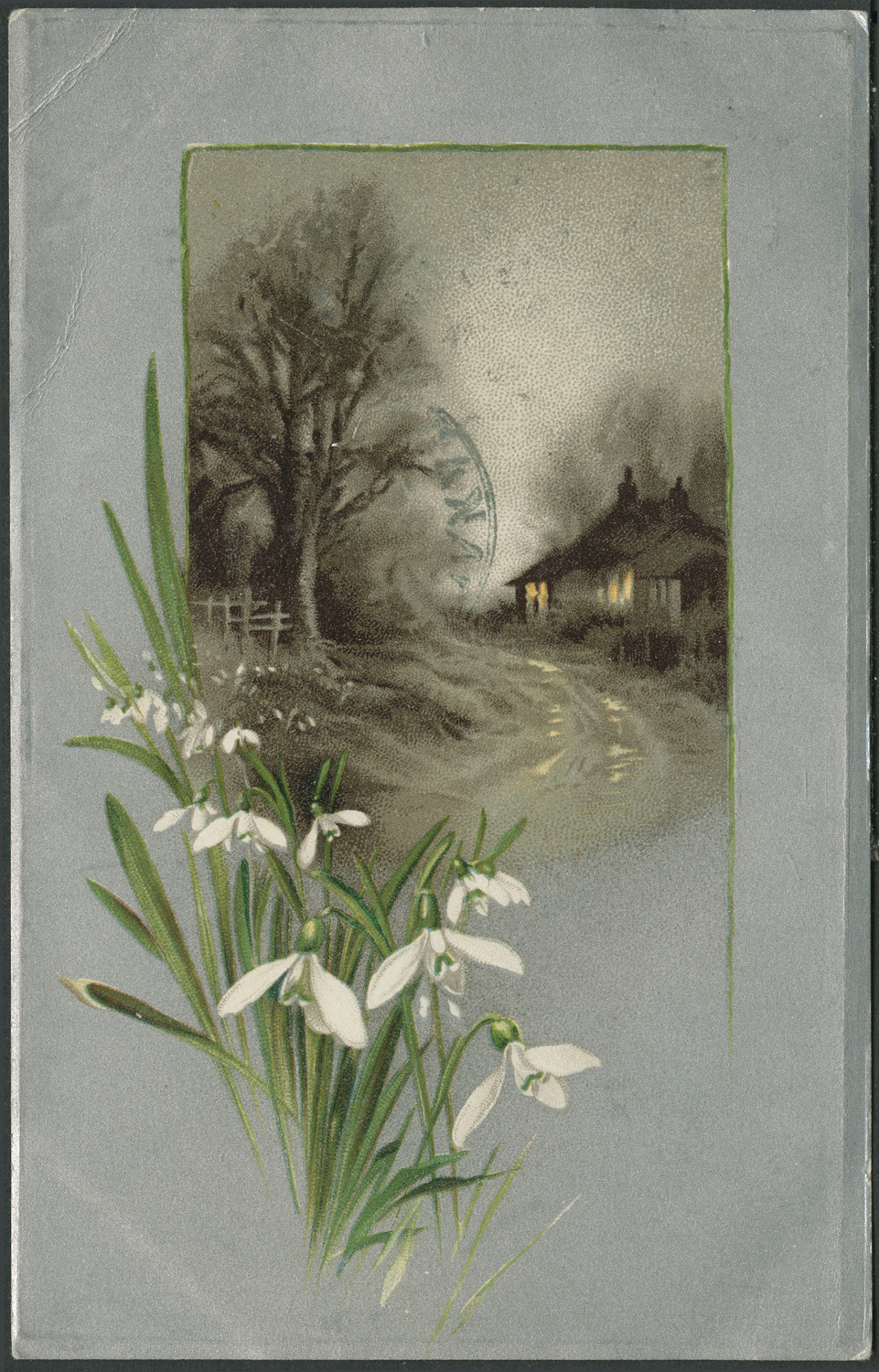 Nazwa: Reprodukcja rysunku lub malarstwa, pejzaż, przedwiośnie, data: 1905, miejsce: , typ obiektu: , wymiary13,8 x 8,9, opis: Szary pejzaż, przedwiośnie, z drogą i chatą ze światłem w okienku, przebiśniegi pod drzewem; w prostokątnej zielonej ramce, srebrne tło.