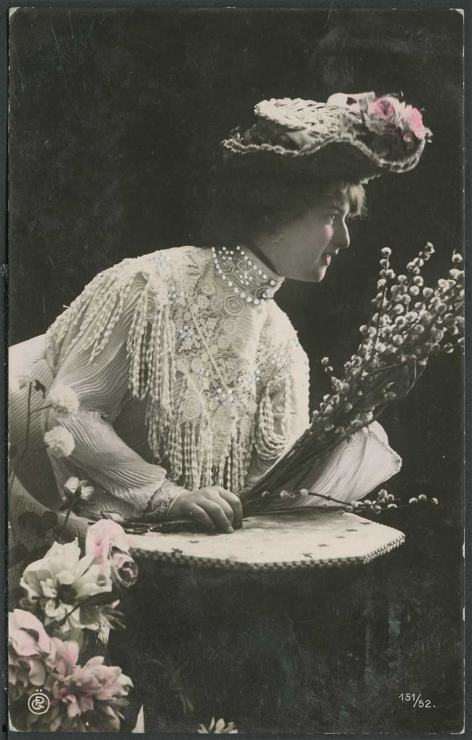 Nazwa: Kobieta z baziami, data: 1905, miejsce: , typ obiektu: , wymiary13,8 x 8,9, opis: Kobieta z wiązką bazi, prawy profil, pochylona nad stołem, półpostać, w białej sukni i kapeluszu, po lewej kwiaty, tło ciemne.