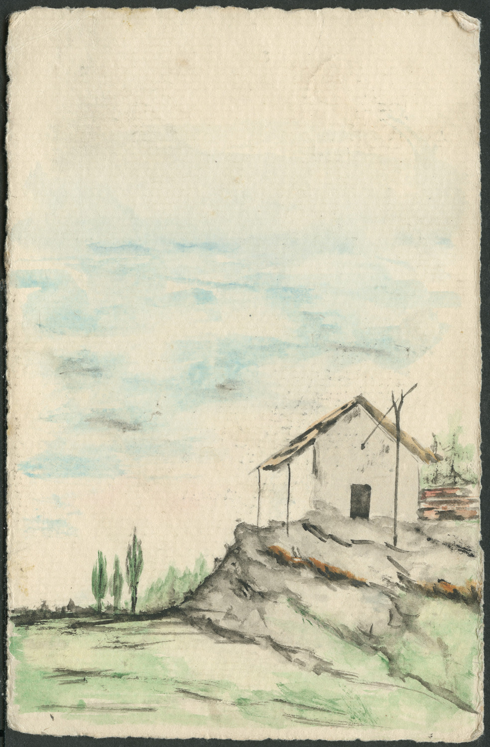 Nazwa: Reprodukcja malarstwa, pejzaż z domem, data: 1905, miejsce: , typ obiektu: , wymiary13,8 x 8,9, opis: Pocztówka, kompozycja w pionie, pejzaż z domem na pagórku, w tle trzy topole.