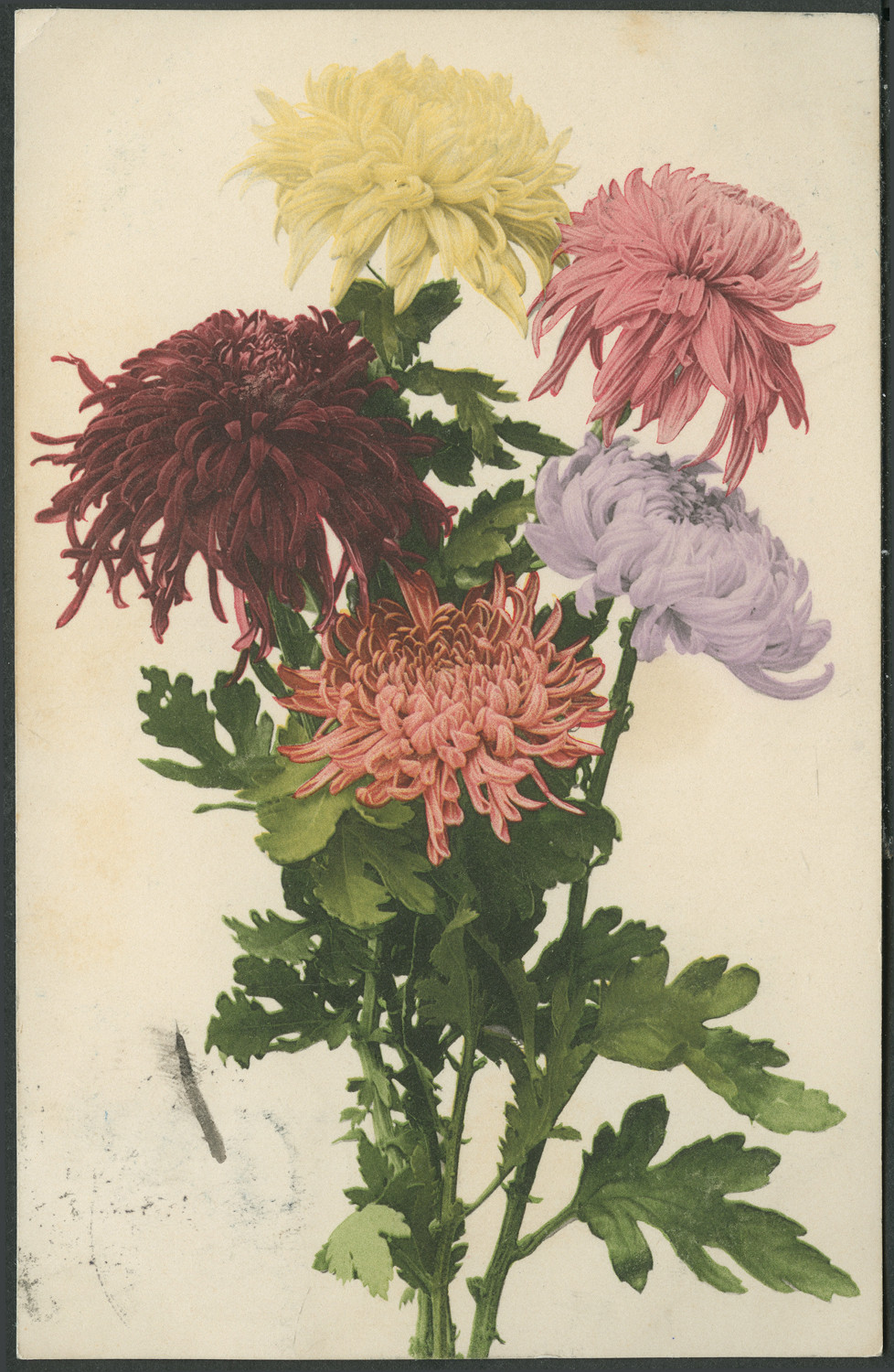 Nazwa: Reprodukcja malarstwa, chryzantemy, data: 1908, miejsce: , typ obiektu: , wymiary13,9 x 9,0, opis: kwiaty; w pionie: pięć różnokolorowych chryzantem ujęcie gór. cz. łodygi z liśćmi, tło białe; o.: nadr. poczt. firm., znaczek austr., stempel: Kraków