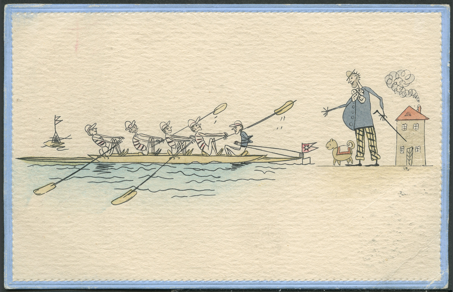 Nazwa: Reprodukcja rysunku satyrycznego, wioślarze, data: ok. 1905, miejsce: , typ obiektu: , wymiary8,9 x 13,9, opis: rysunek - scenka satyryczna, wioślarze przy brzegu, na kt. męzczyzna z psem i domek. Tłoczona ramka niebieska; odwr.: nadr. poczt., pieczęć tusz., znaczek austr., stempel