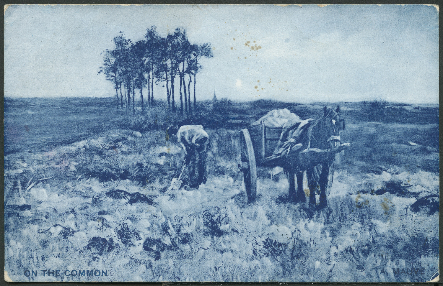 Nazwa: Reprodukcja malarstwa, Anton Mauve, "On the common", data: ok. 1906, miejsce: , typ obiektu: , wymiary8,8 x 13,9, opis: repr. światłodrukowa obrazu A. Mauve, "On the common": scena rodzajowa; druk w kol. szafirowym, o.: brąz. nadr. poczt. i firm., znaczek austr., stempel: Ławoczne