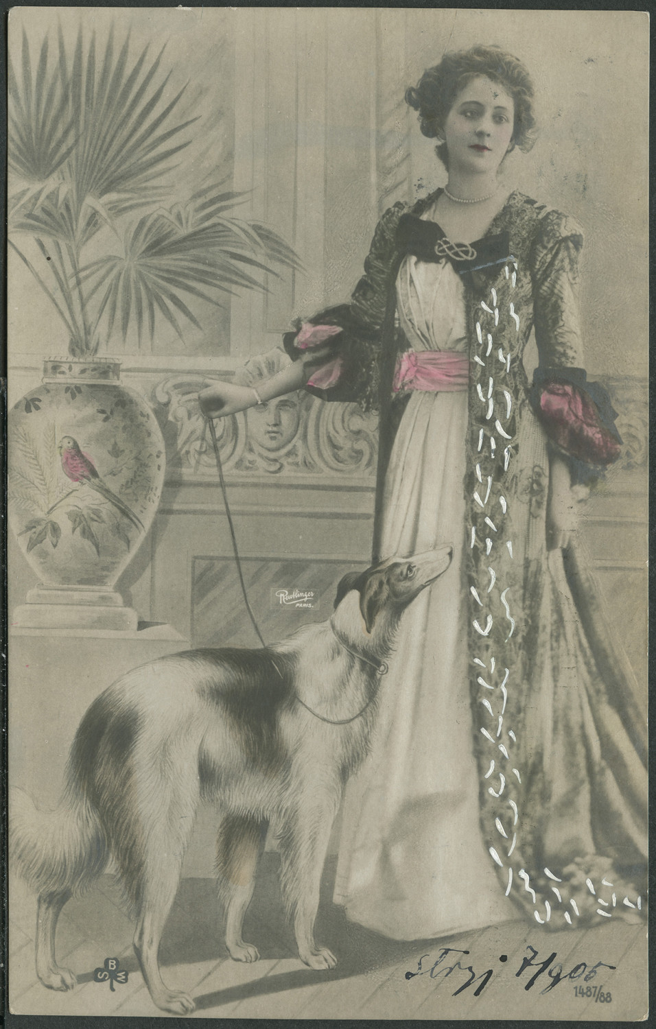 Nazwa: Reprodukcja, kobieta i pies, data: 1905, miejsce: , typ obiektu: , wymiary13,7 x 8,7, opis: pocztówka reprod. sys. i fot. ?, na matowym pap., cz.-b., ton. k. sepii, kolorowana, portret kobiety we wnętrzu, z chartem na smyczy; o.: nadr. poczt., znaczek austr. stempel