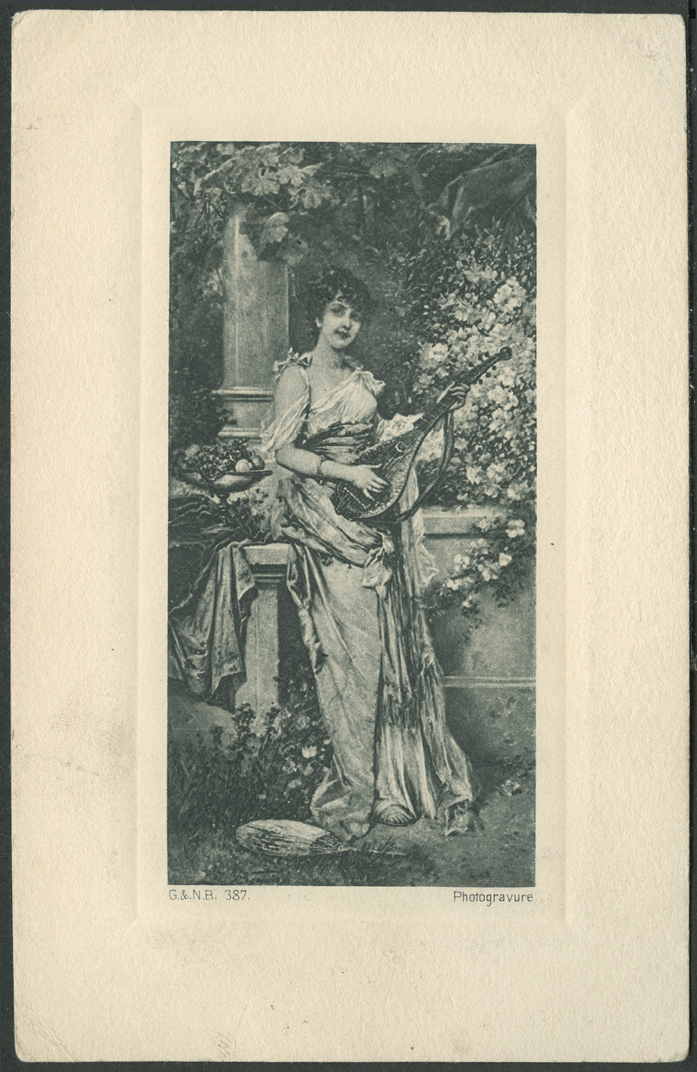 Nazwa: Reprodukcja malarstwa, kobieta z instrumentem, data: 1905, miejsce: , typ obiektu: , wymiary13,8 x 8,9, opis: pocztówka druk cz.-b., w pionie; kobieta, stoi w ogrodzie wśród kwiatów; wokół tłoczenie wklęsłe, światło białe; o.: nadr. poczt., znaczek aust.