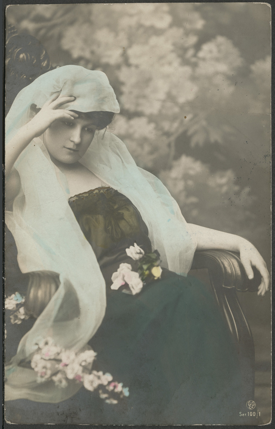 Nazwa: Kobieta w welonie, portret, data: pocz. XX w., miejsce: , typ obiektu: , wymiary14,0 x 8,8, opis: kobieta siedząca w jasnym welonie; odwr.: nadr. poczt., znaczek austr., stempel