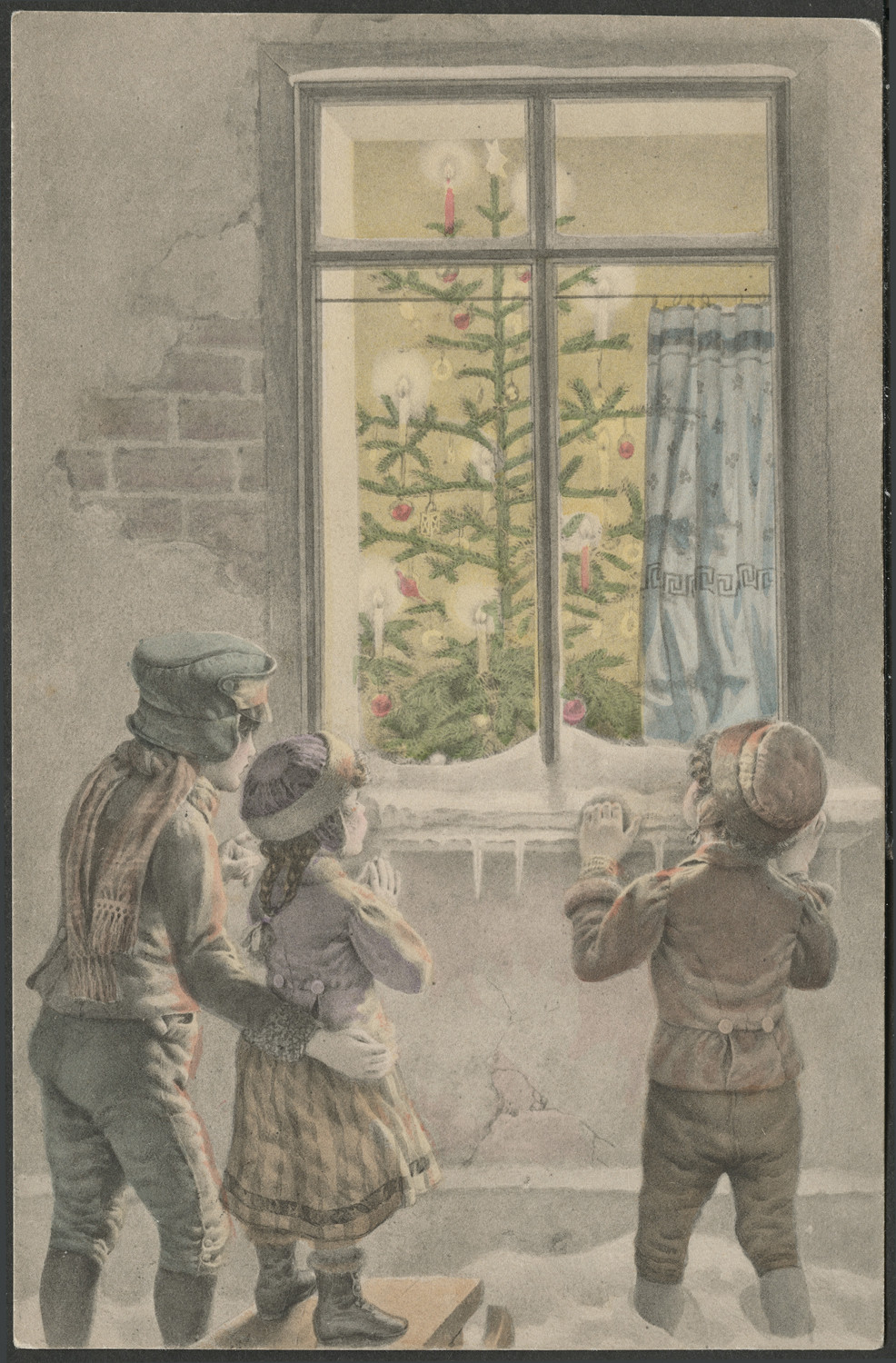 Nazwa: Reprodukcja rysunku, choinka, data: ok. 1905, miejsce: , typ obiektu: , wymiary13,8 x 9,0, opis: poczt. druk kolor, w pionie, troje dzieci zaglądających przez okno do domu i podziwiających choinkę; odwr.: nadr. poczt. i firm., znaczek austr. i stempel: Borzęcin