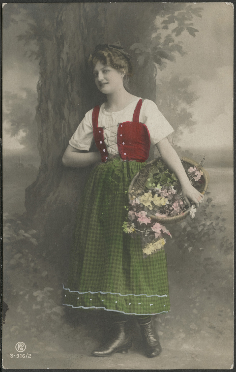 Nazwa: Kobieta z kwiatami, data: ok. 1906, miejsce: , typ obiektu: , wymiary13,8 x 8,7, opis: pocztówka, fot. cz.-b. kolorowana, pap. matowy, w pionie; dziewczyna z kwiatami w koszyku na tle dębu; odwr.: czerwony nadr. poczt. znaczek austr. i stempel