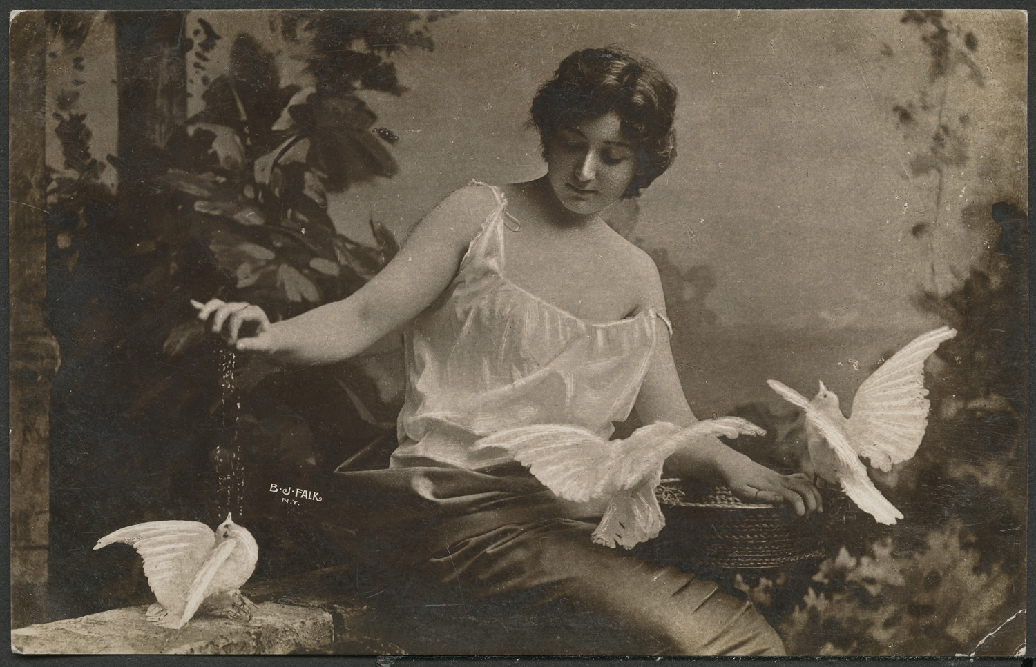 Nazwa: Kobieta wśród gołębi, data: ok. 1906, miejsce: , typ obiektu: , wymiary8,7 x 13,6, opis: poczt., kobieta siedząca wśród białych gołębi, fot. cz.-b., ton., pap. błyszczący, w poziomie, odwr.: nadr. poczt., zn. austr. i stempel prostokątny: Stryj, 7.3.06