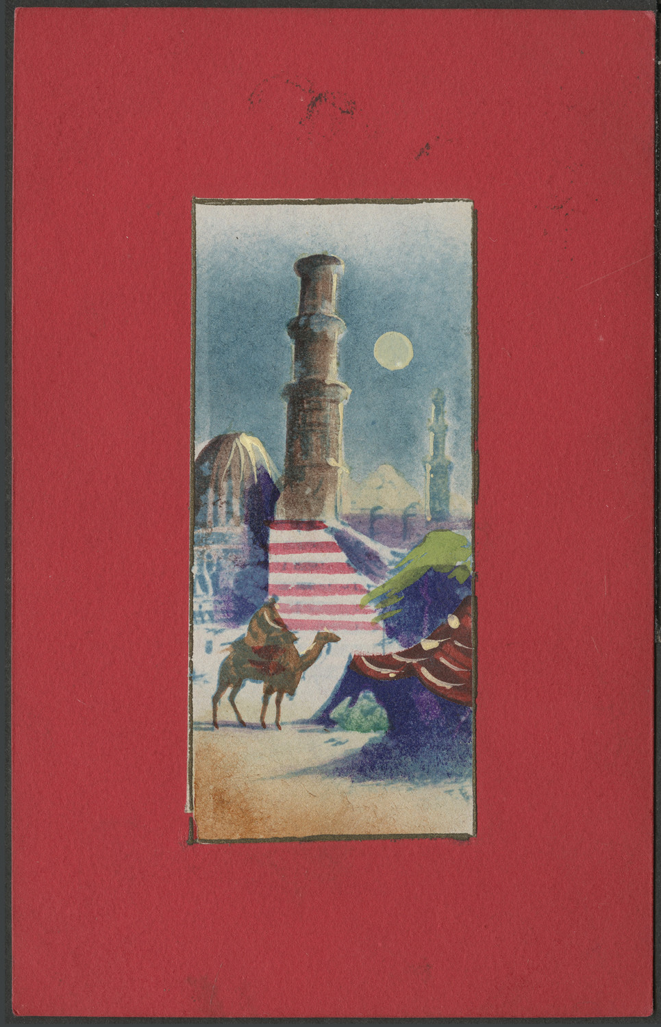 Nazwa: Reprodukcja malarstwa, widok orientalny, data: 1906, miejsce: , typ obiektu: , wymiary13,9 x 8,8, opis: pocztówka, na czerwonym tle naklej. kolor. ilustracja: jeździec na wielbłądzie na tle architektury - wieże minaretów; o.: nadr. pocztówk., znaczek austr., stempel