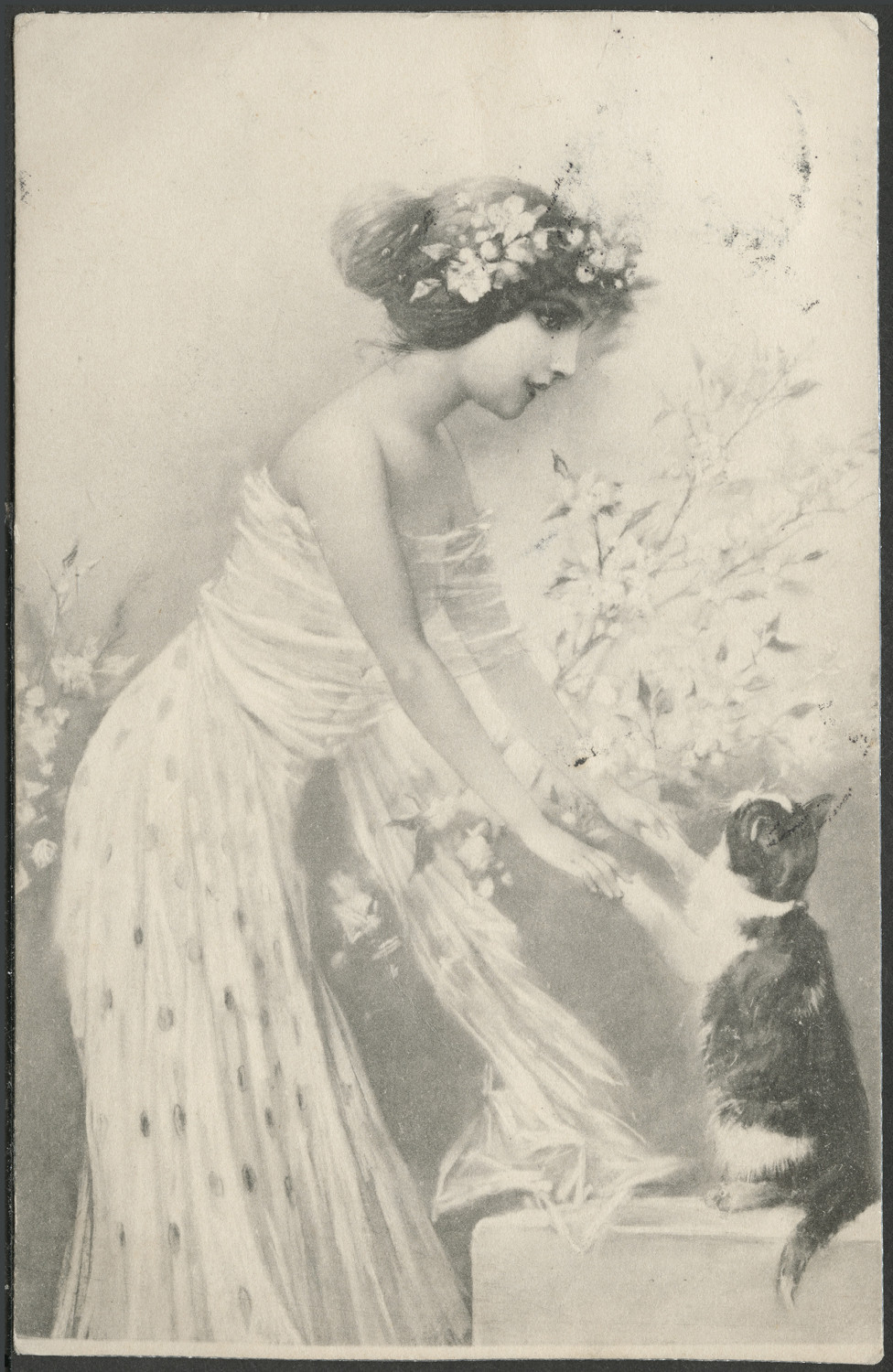 Nazwa: Reprodukcja rysunku, kobieta i kot, data: ok. 1906, miejsce: , typ obiektu: , wymiary13,7 x 8,8, opis: pocztówka, kobieta bawiąca się z kotkiem, odwr.: nadr. poczt., znaczek austr. stempel