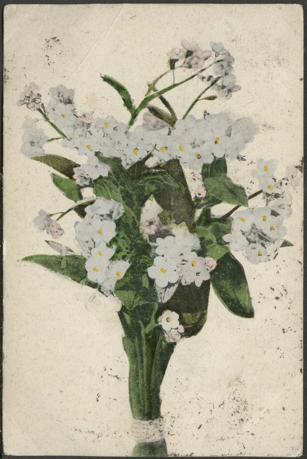 Nazwa: Reprodukcja malarstwa, niezapominajki, data: ok. 1909, miejsce: , typ obiektu: , wymiary14,0 x 9,3, opis: druk barwny kolorowany, bladoniebieskie niezapominajki, białe tło, kompoz. w pionie; odwr.: czerwony nadr. poczt., i nadruki firm., brak znaczka, stemple napis cyrylicą