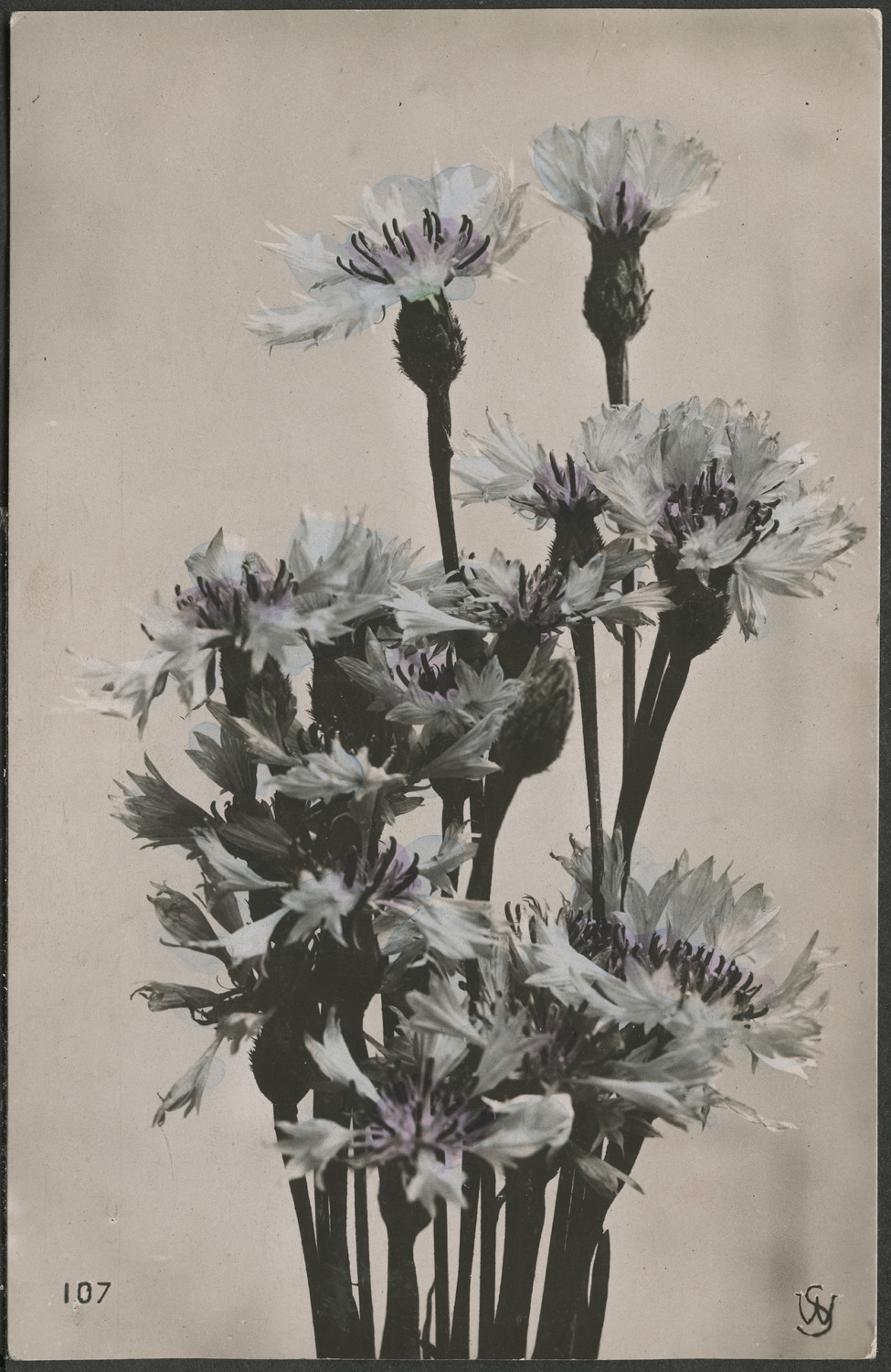Nazwa: Reprodukcja malarstwa, chabry, data: ok. 1908, miejsce: , typ obiektu: , wymiary13,7 x 8,9, opis: poczt., bukiet chabrów, gór. cz. rośliny, na jas. tle; fot. cz.-b., ton. kol. sepii, kolorowana, pap. fot. błyszczący; komp. w pionie; odwr.: nadr. poczt., znaczek austr., stempel.