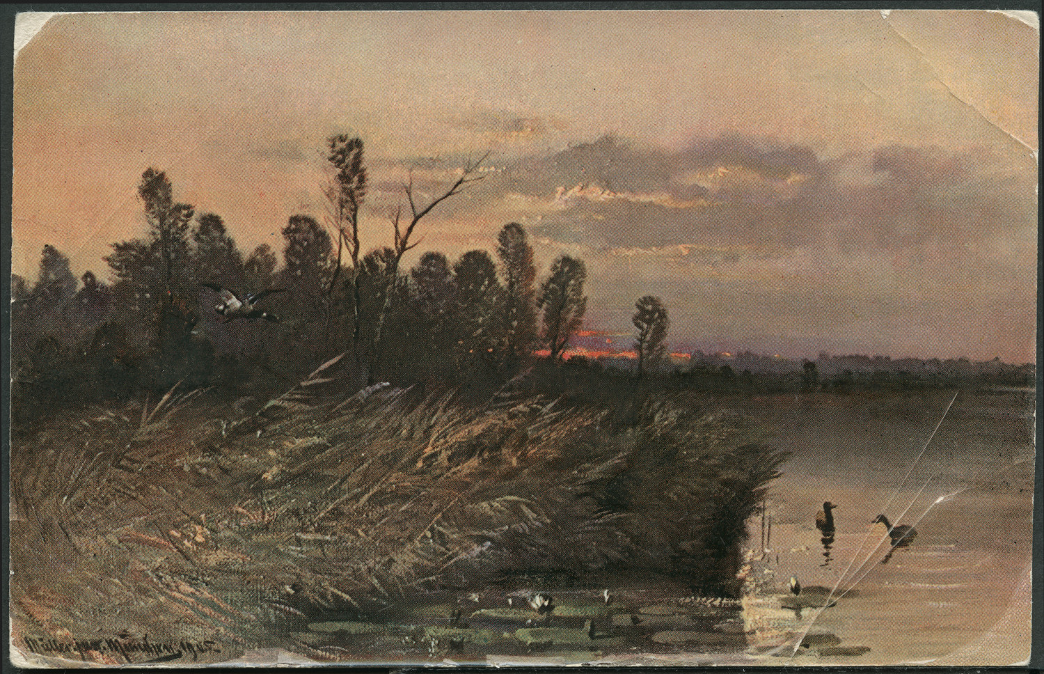 Nazwa: Reprodukcja malarstwa, Moritz Muller, pejzaż z jeziorem, data: ok. 1907, miejsce: , typ obiektu: , wymiary8,8 x 13,9, opis: poczt., pejzaż, jezioro, dzikie kaczki, trzciny i nenufary, zachód słońca; sygn.; w poziomie; drok kolor. pap. błyszcz.; o: ziel. nadr. poczt., znaczek austr., stempel: Złoczów