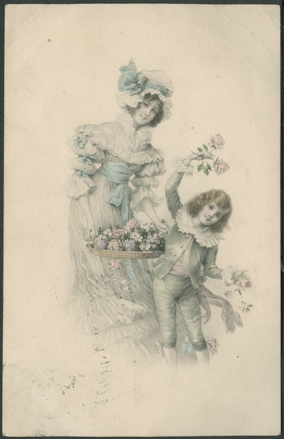 Nazwa: Reprodukcja rysunku, kobieta i chłopiec z kwiatami, data: ok. 1906, miejsce: , typ obiektu: , wymiary14,1 x 9,0, opis: pocztówka druk., pośrodku delikatny kolor. rysunek na krem. tle, kobieta i chłopiec z kwiatami, pochyleni w prawo; o.: nadr. poczt.