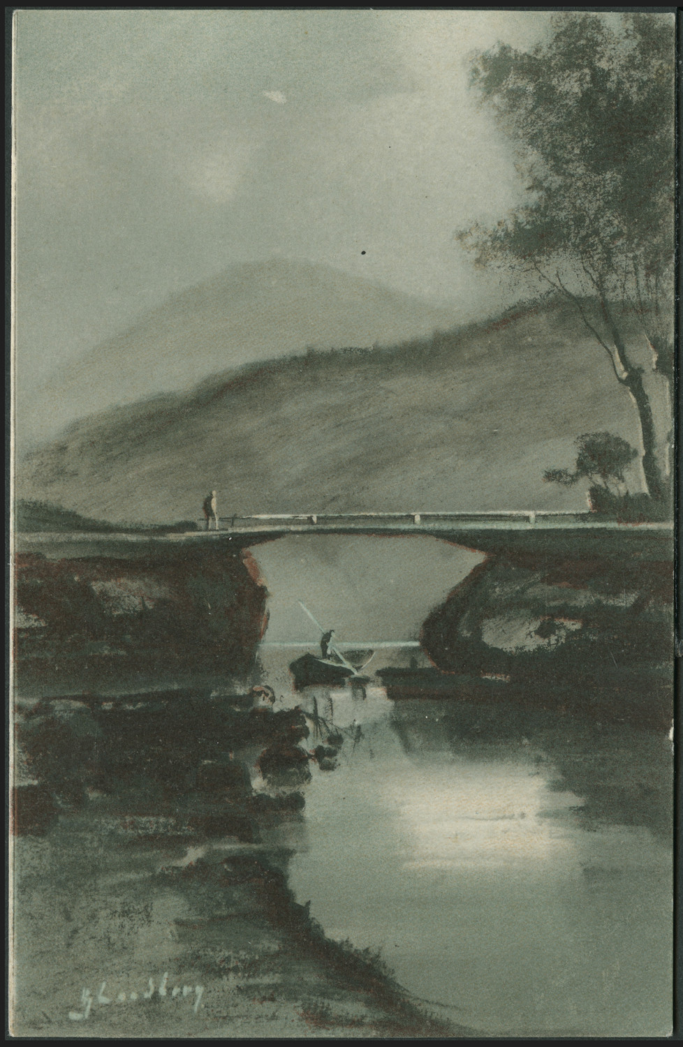 Nazwa: Reprodukcja malarstwa, Landberg, widok mostu, data: ok. 1907, miejsce: , typ obiektu: , wymiary13,8 x 8,8, opis: pejzaż z rzeką i mostem, reprod. mal., druk; odwr.: zielony nadr. poczt., firm., koresp. odręcz. atramentem, znaczek austr., stempel