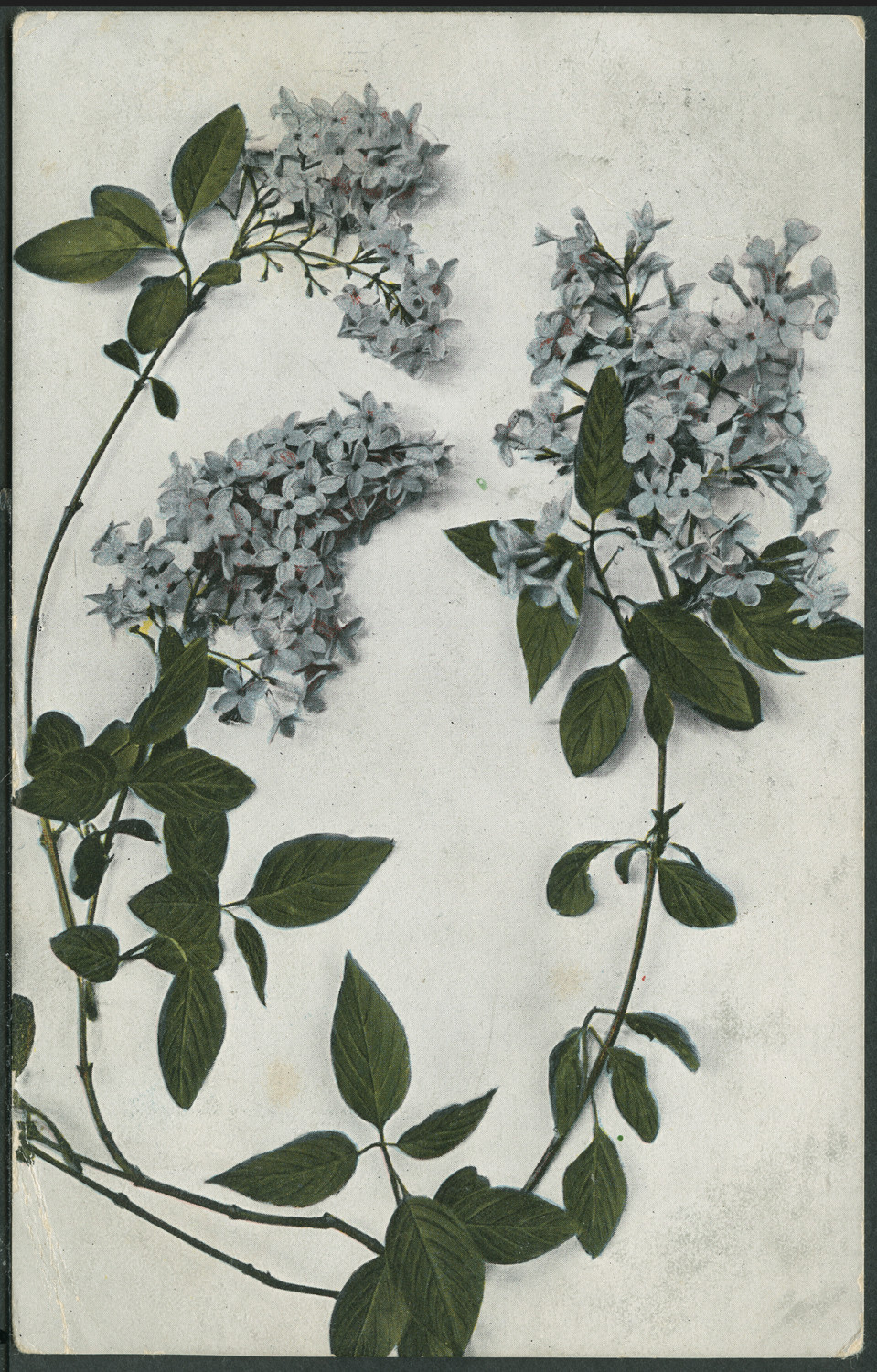 Nazwa: Reprodukcja rysunku, kwiaty białego bzu, data: ok. 1909, miejsce: , typ obiektu: , wymiary13,8 x 8,8, opis: kwiaty, druk barwny; odwr.: brąz. nadr. poczt., firm., koresp. odręcz. atramentem, stempel: Roma 09, znaczek odklejony