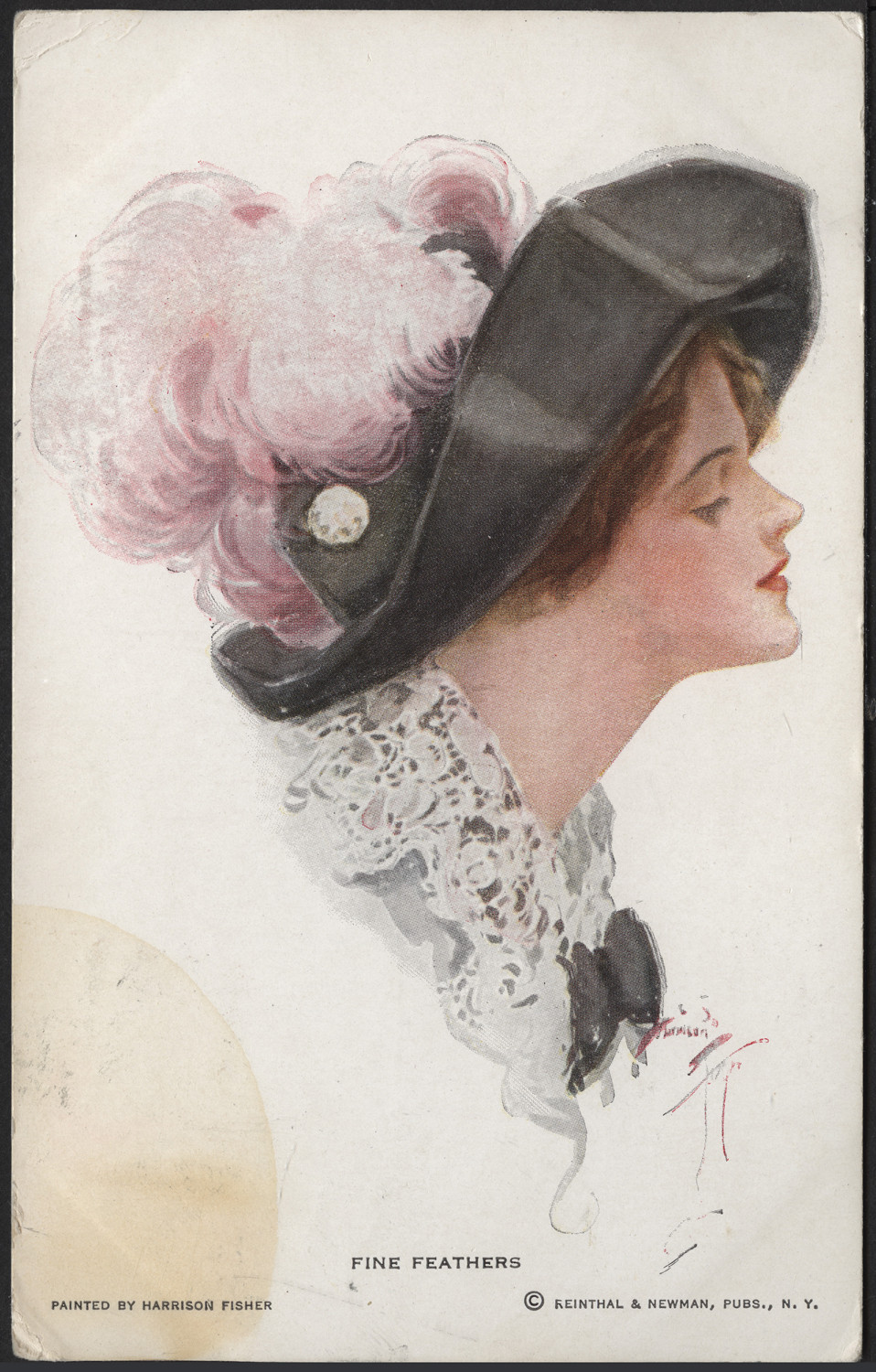 Nazwa: Reprodukcja malarstwa, Harrisson Fischer, kobieta w kapeluszu, data: ok. 1914, miejsce: , typ obiektu: , wymiary14,1 x 8,9, opis: reprod. mal., wg Harrisson Fischer druk, portret kobiety z prawego profilu, w kapeluszu; o.: nadr. poczt., koresp. odręcz. atramentem znaczek ros., stempel: Warszawa (cyrylicą)