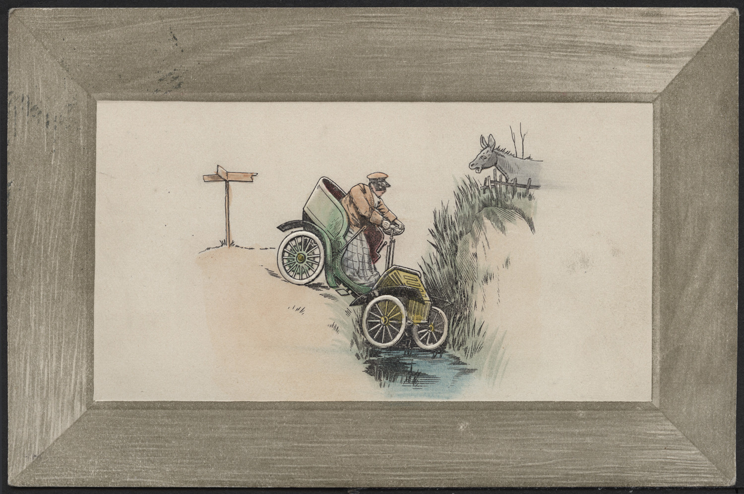 Nazwa: Reprodukcja rysunku, scena humorystyczna z samochodem, data: ok. 1906, miejsce: , typ obiektu: , wymiary9,1 x 13,9, opis: reprod. rys.,Mary Mill. F. P. S, scenka humoryst., druk; odwr.: czarny nadr. poczt., firm., koresp. odręcz. atramentem, znaczek austr., wieloboczny stempel: Stryj