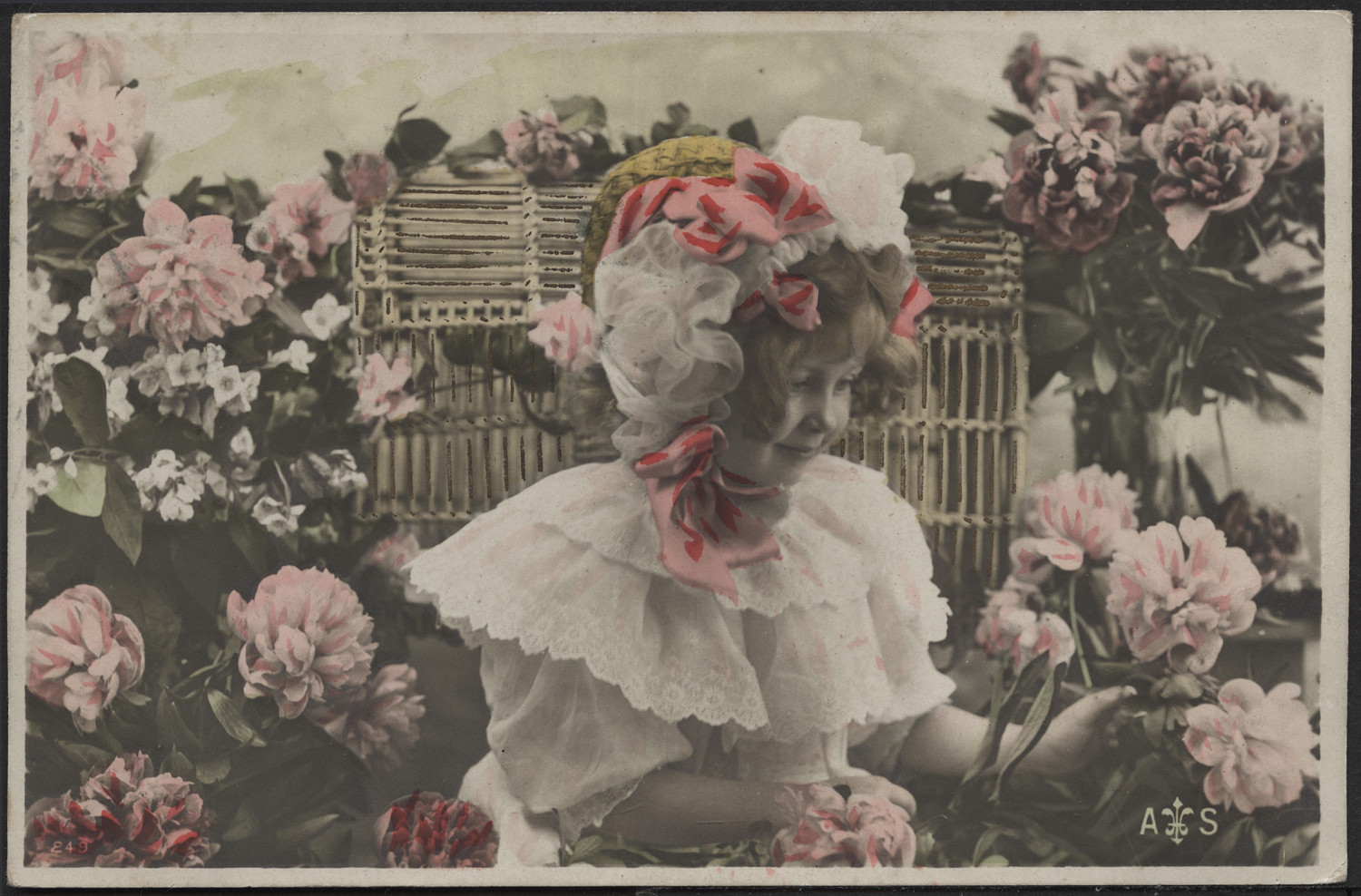 Nazwa: Dziewczynka wśród kwiatów, portret, data: ok. 1904, miejsce: , typ obiektu: , wymiary9,1 x 13,9, opis: reprod. fot., portret dziewczynki wśród kwiatów, fot. cz.-b. ton. na k. sepii, kolorow.; odwr.: czarny nadr. poczt., firm., koresp. odręcz. atramentem znaczek austr., stempel