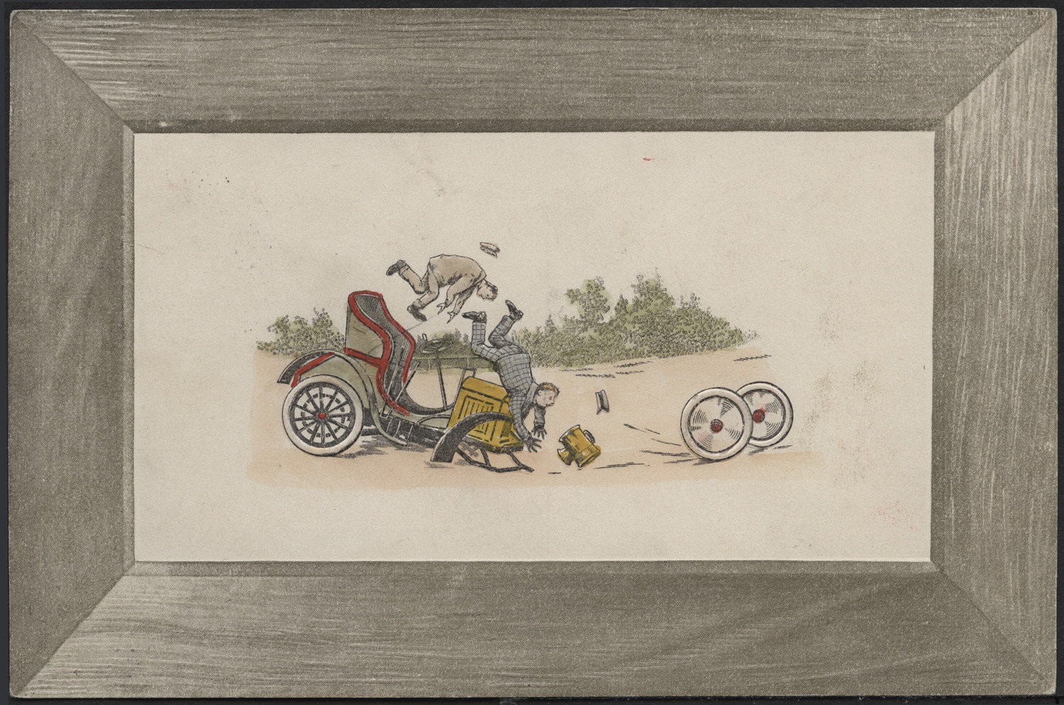 Nazwa: Reprodukcja rysunku, scena humorystyczna z samochodem, data: ok. 1906, miejsce: , typ obiektu: , wymiary9,1 x 13,9, opis: reprod. rys., Mary Mill. F. P. S., scenka humoryst. z samochodem, druk; odwr.: czarny nadr. poczt., firm., koresp. odręcz. atramentem znaczek austr., stempel wieloboczny: Stryj