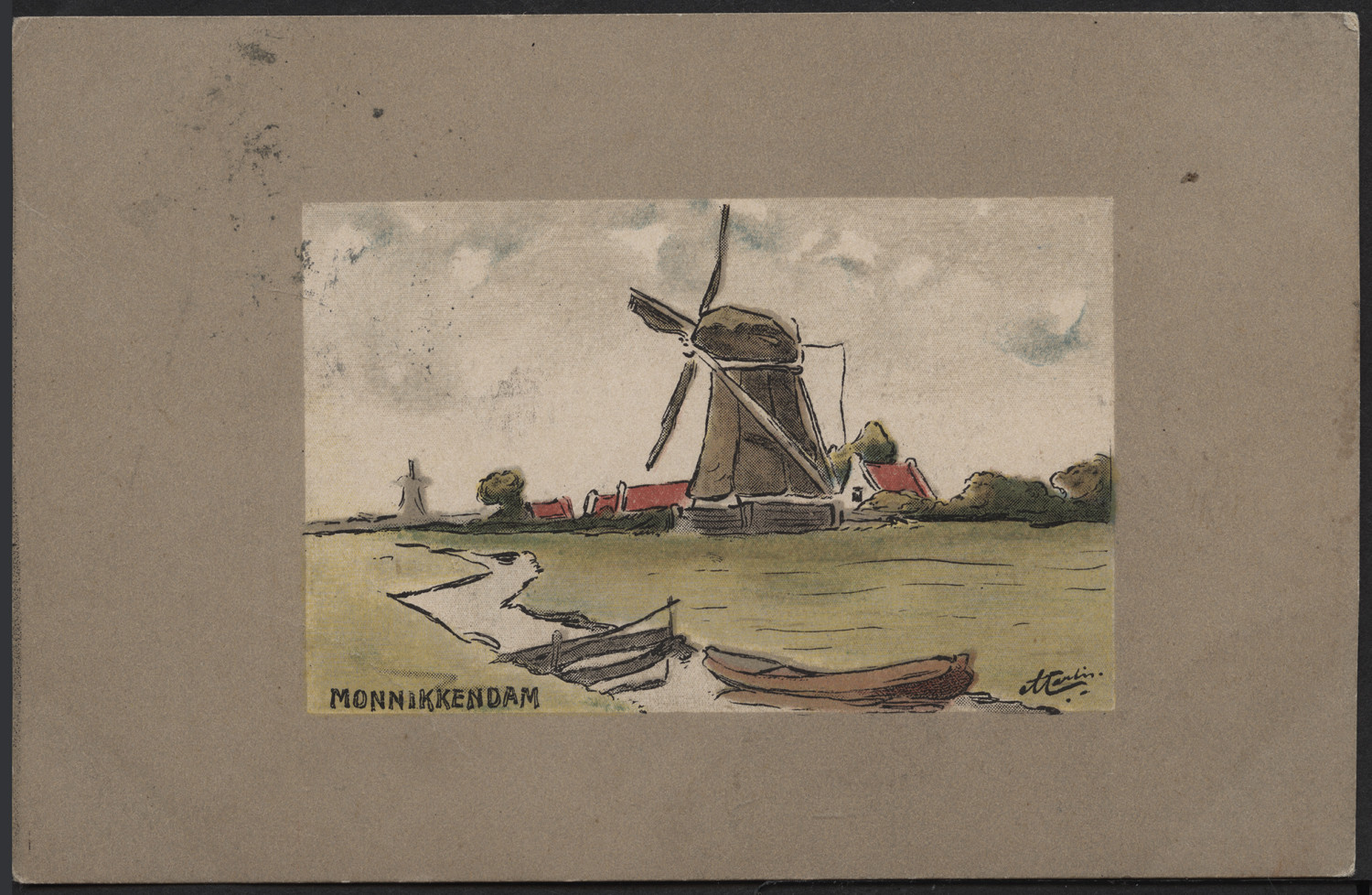 Nazwa: Reprodukcja rysunku, widok z wiatrakiem, data: ok. 1906, miejsce: , typ obiektu: , wymiary9,0 x 13,9, opis: pejzaż z wiatrakiem w szerokim szarym obramieniu, reprod. druk; odwr.: czarny nadr. poczt., firm., koresp. odręcz. atramentem, ślad znaczka, stempel
