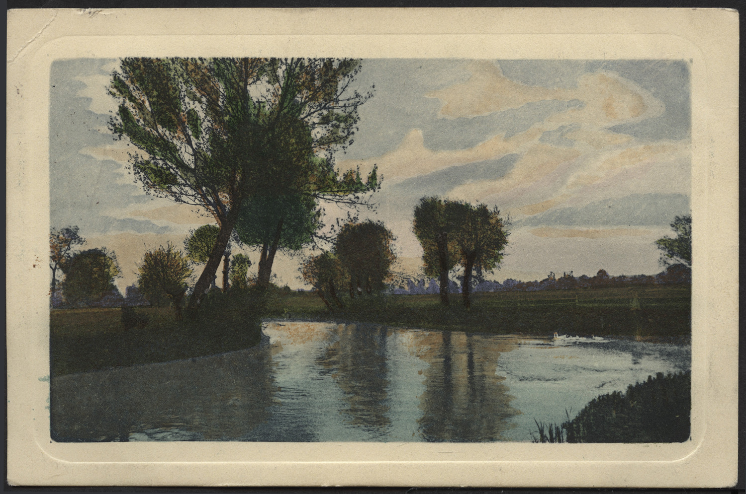 Nazwa: Reprodukcja rysunku, pejzaż z rzeką, data: ok. 1908, miejsce: , typ obiektu: , wymiary9,0 x 13,9, opis: pejzaż z rzeką; nadruk poczt., , reprod., druk barwny wg fot.; odwr.: czarny nadr. poczt., firm., koresp. odręcz. atramentem znaczek austr., stempel
