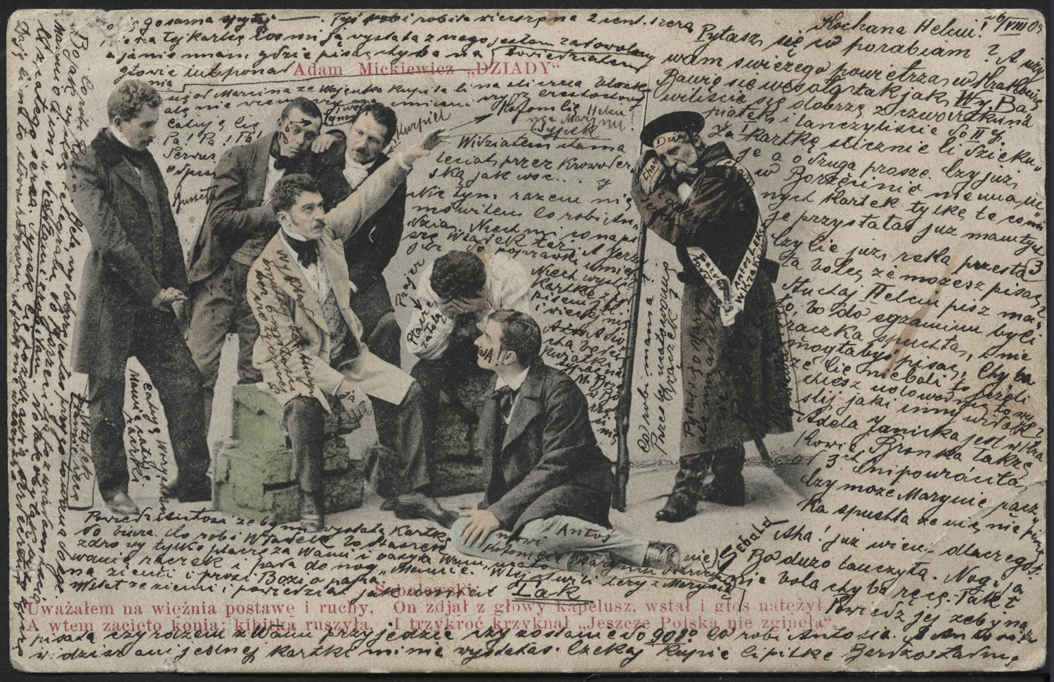 Nazwa: Reprodukcja rysunku, "Dziady" w inscenizacji Stanisława Wyspiańskiego, data: 1901, miejsce: , typ obiektu: , wymiary9,0 x 14,1, opis: "Dziady", scena rozmowy więźniów z Sobolewskim, portret zbiorowy.
