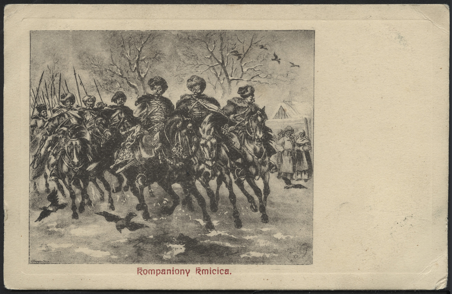 Nazwa: Reprodukcja malarstwa, "Kompaniony Kmicica", data: ok. 1908, miejsce: , typ obiektu: , wymiary9,1 x 14,2, opis: "Kompaniony Kmicica", scena z "Potopu" H. Sienkiewicza, druk.