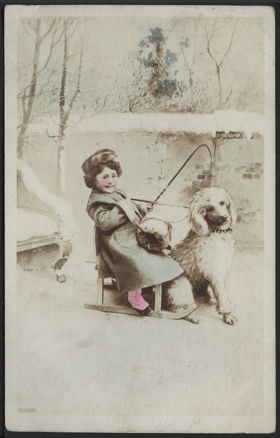 Nazwa: Dziecko na sankach, data: ok. 1905, miejsce: , typ obiektu: , wymiary14,1 x 8,9, opis: Scenka, portret, dziecko na sankach z pudlem, w parku ?;